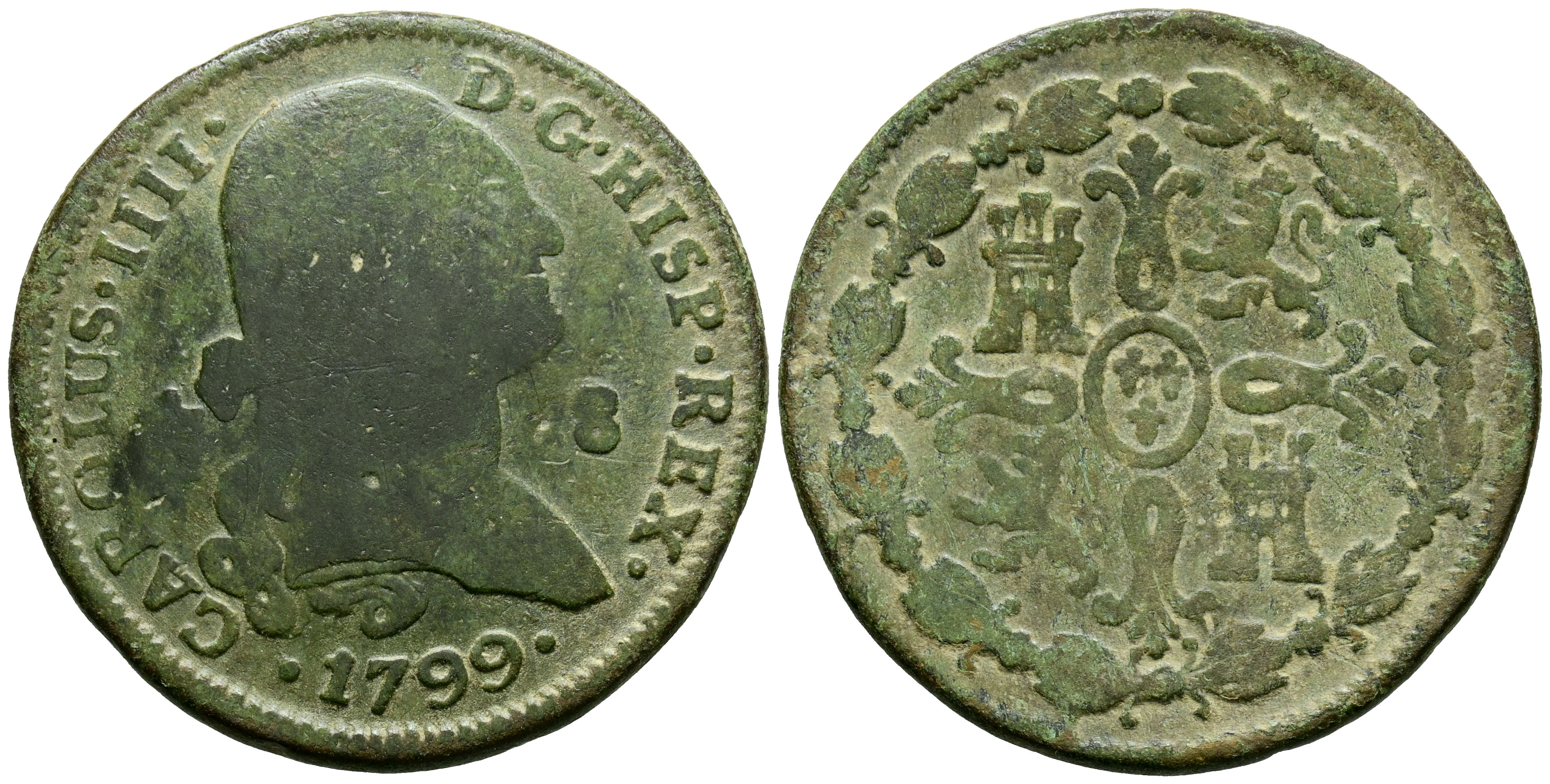 CARLOS IV (1788-1808). 8 Maravedis. (Ar. 10.41g/32mm). 1799. Segovia. (Cal-2019-76). Almost Very Fine. Green patina.