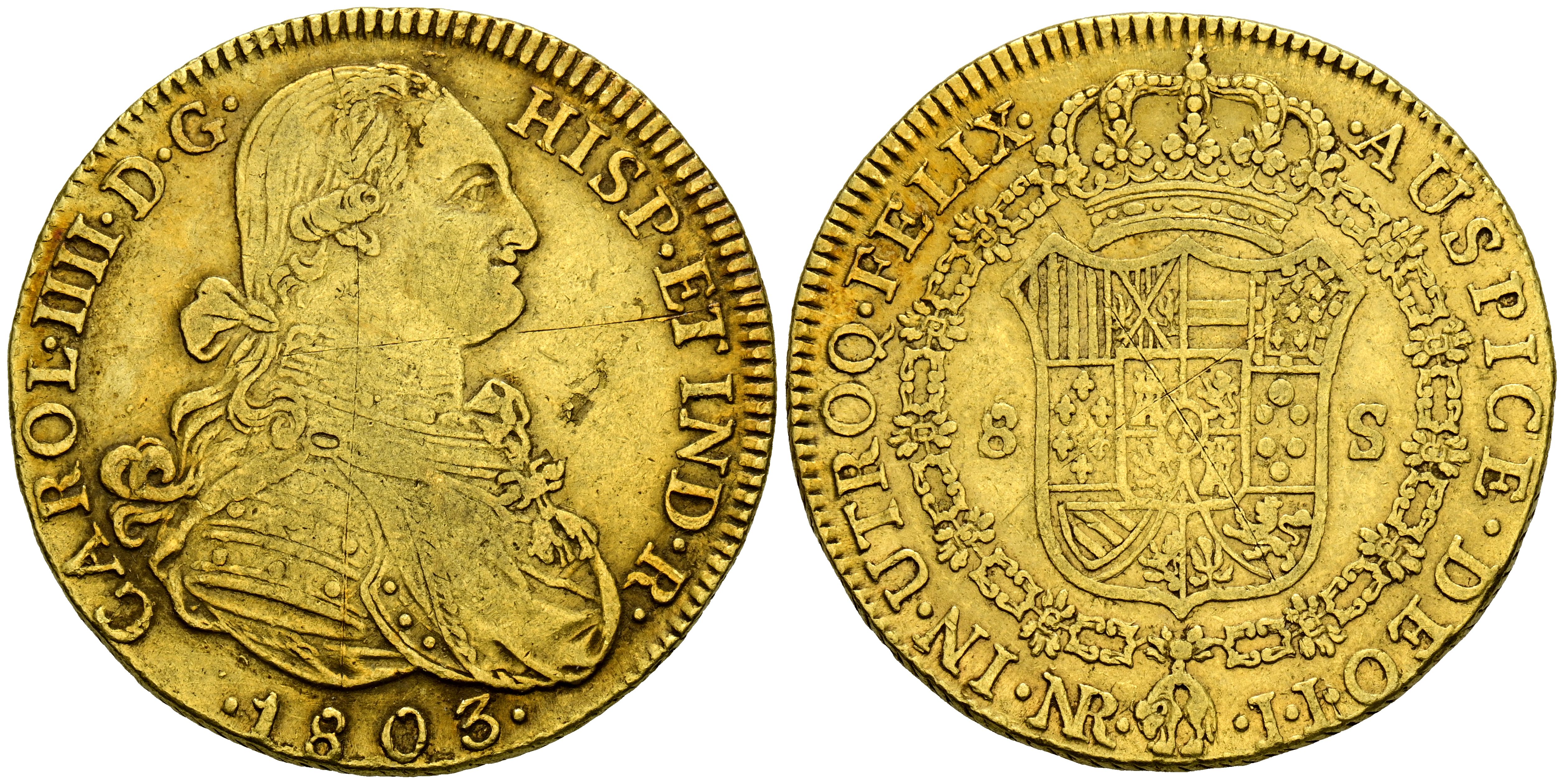 CARLOS IV (1788-1808). 8 Escudos. (Au. 26.98g/36mm). 1803. Santa Fe de Nuevo Reino JJ. (Cal-2019-1742). Almost Very Fine. Stripes on front and back.