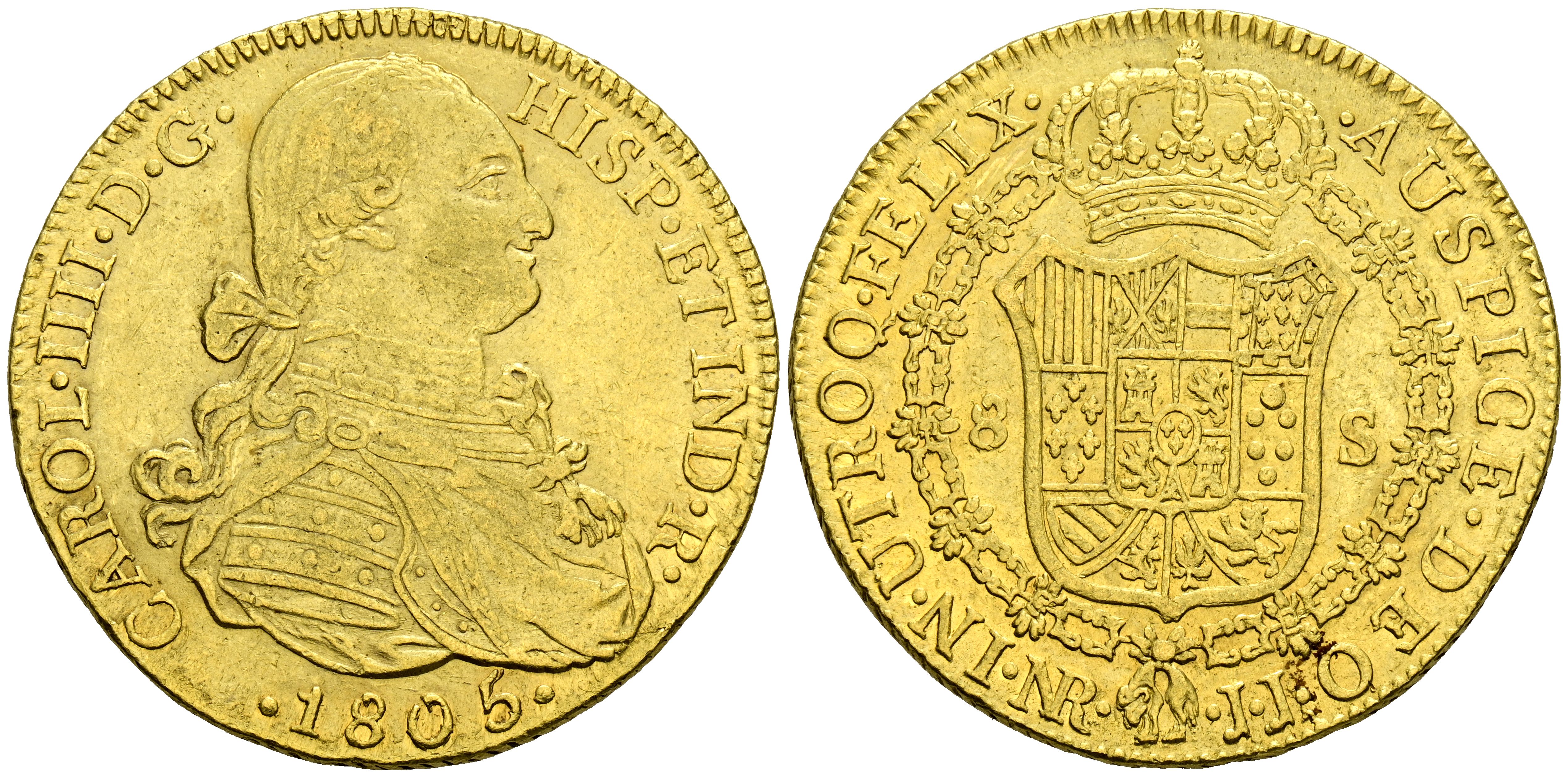 CARLOS IV (1788-1808). 8 Escudos. (Au. 27.00g/36mm). 1805. Santa Fe de Nuevo Reino JJ. (Cal-2019-1746). Almost Extremely Fine.