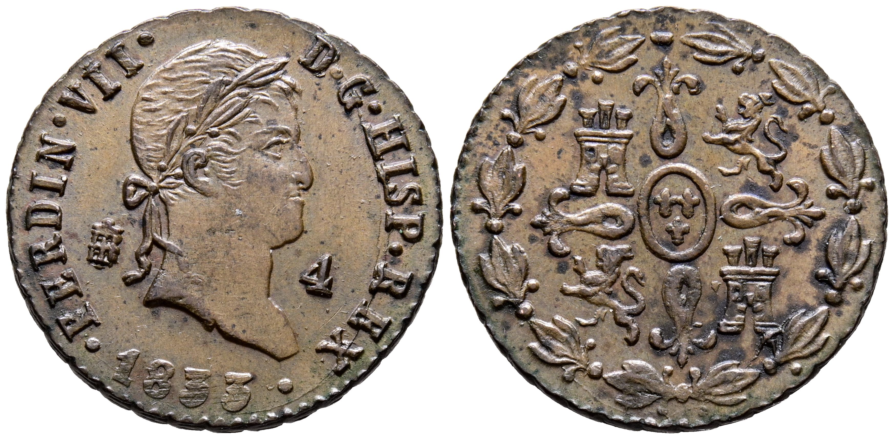 FERDINAND VII (1808-1833). 4 Maravedis. (Ae. 5.49g/25mm). 1833. Segovia. (Cal-2019-188). Extremely Fine. Rust spots. Careless coinage.