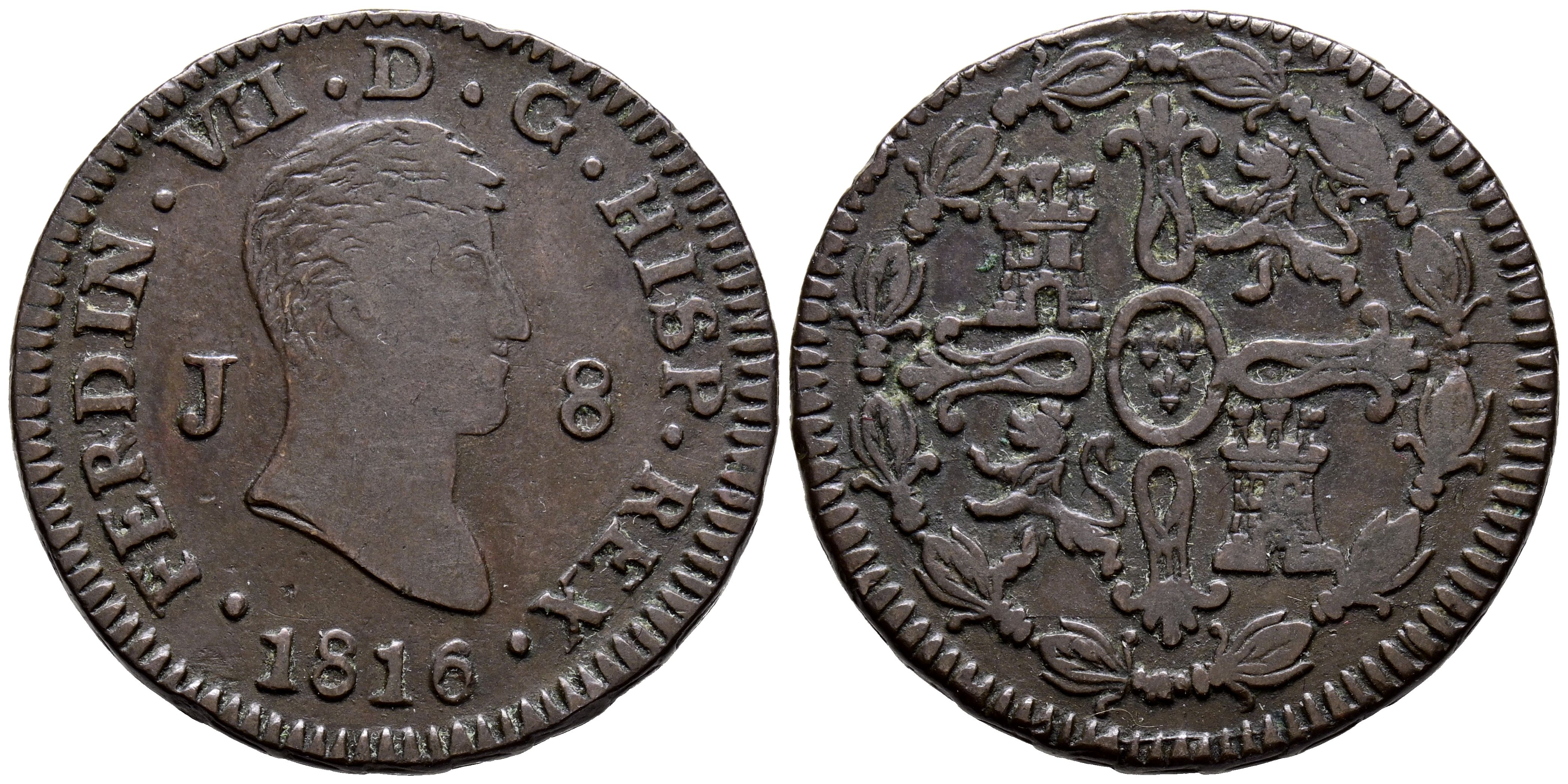 FERDINAND VII (1808-1833). 8 Maravedis. (Ae. 9.22g/30mm). 1816. Jubia. (Cal-2019-195). Naked bust. Very Fine