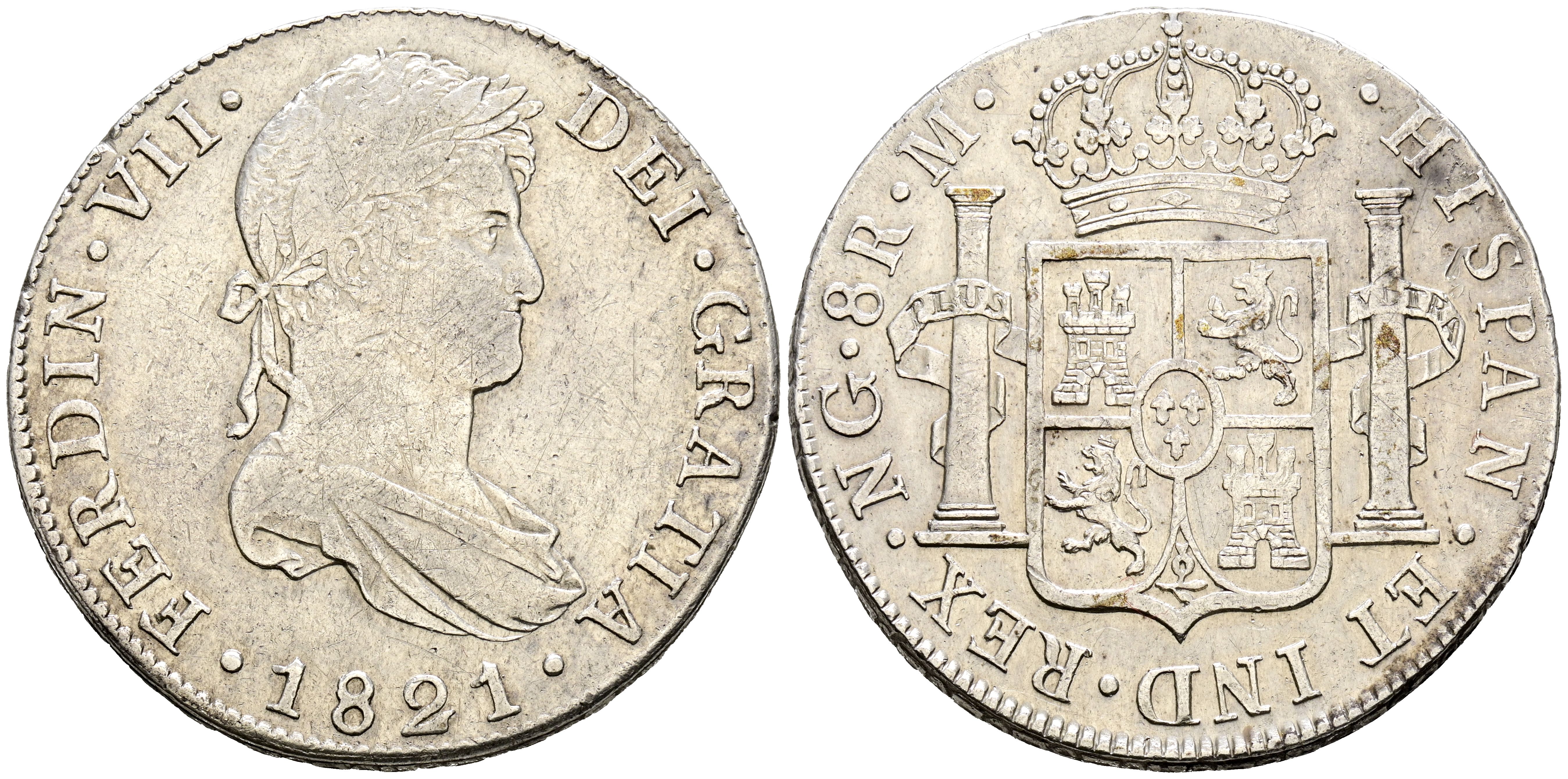 English FERDINAND VII (1808-1833). 8 Reales. (Ar. 26.87g/37mm). 1821. Guatemala M. (Cal-2019-1236). Very Fine. Cleaned.