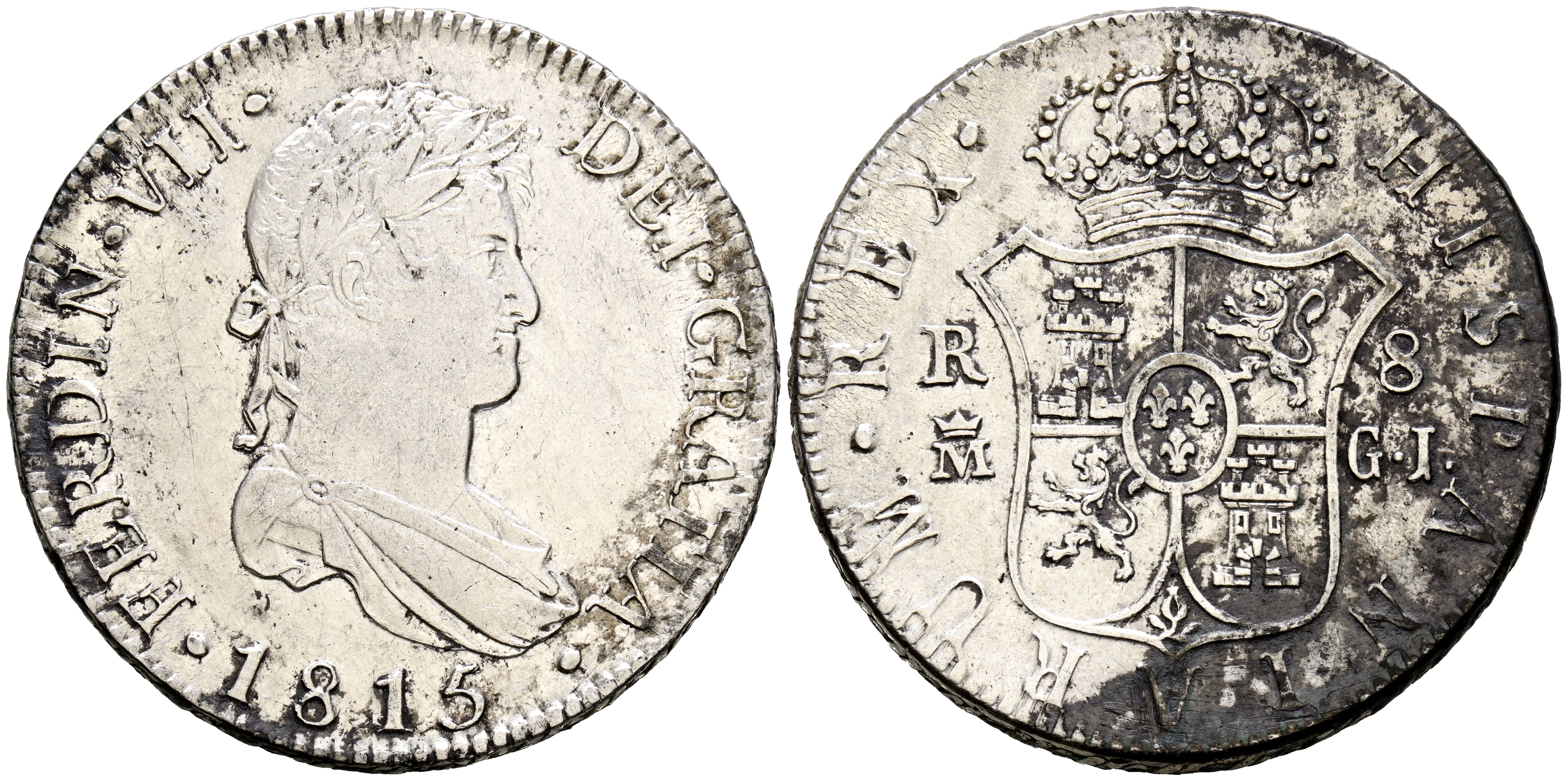 English FERDINAND VII (18080-1833). 8 Reales. (Ar. 26.88g/39mm). 1815. Madrid GJ. (Cal-2019-1269). Very Fine. Oxidations.