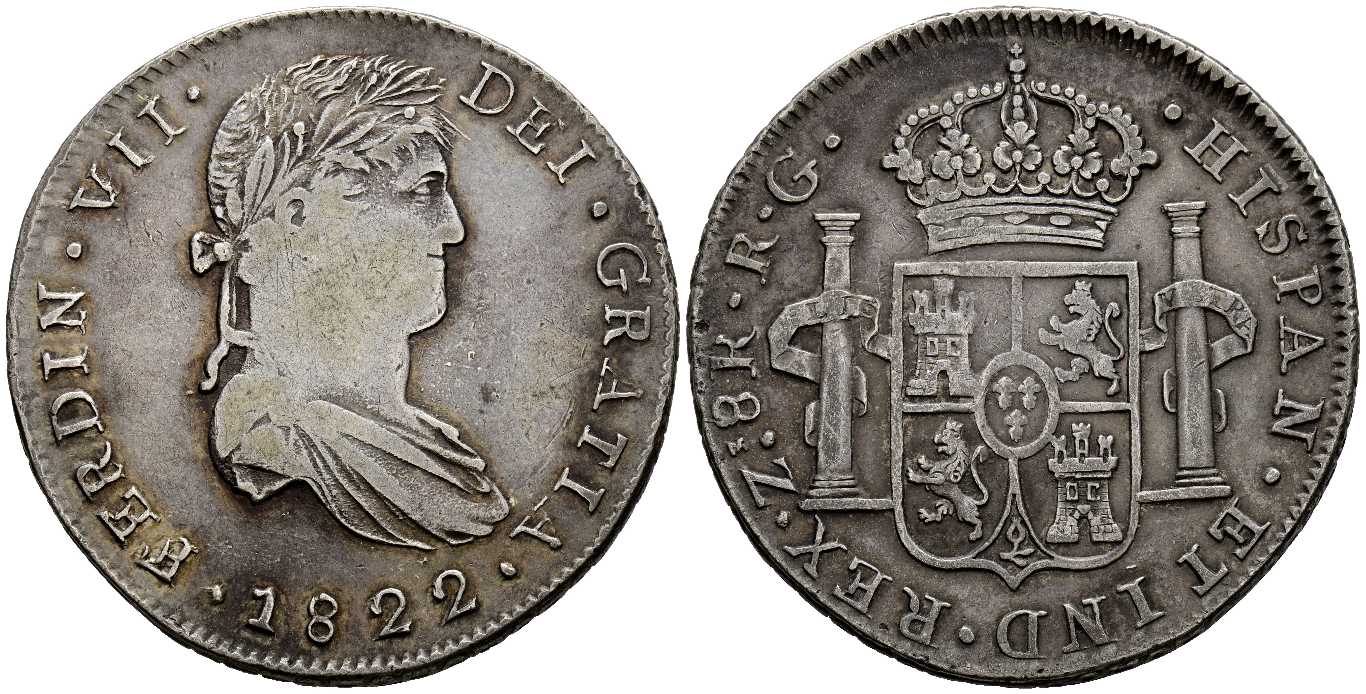 FERDINAND VII (1808-1833). 8 Reales. (Ar. 26.55g/39mm). 1822. Zacatecas RG. (Cal-2019-1472). Good Very Fine/ Very Fine.