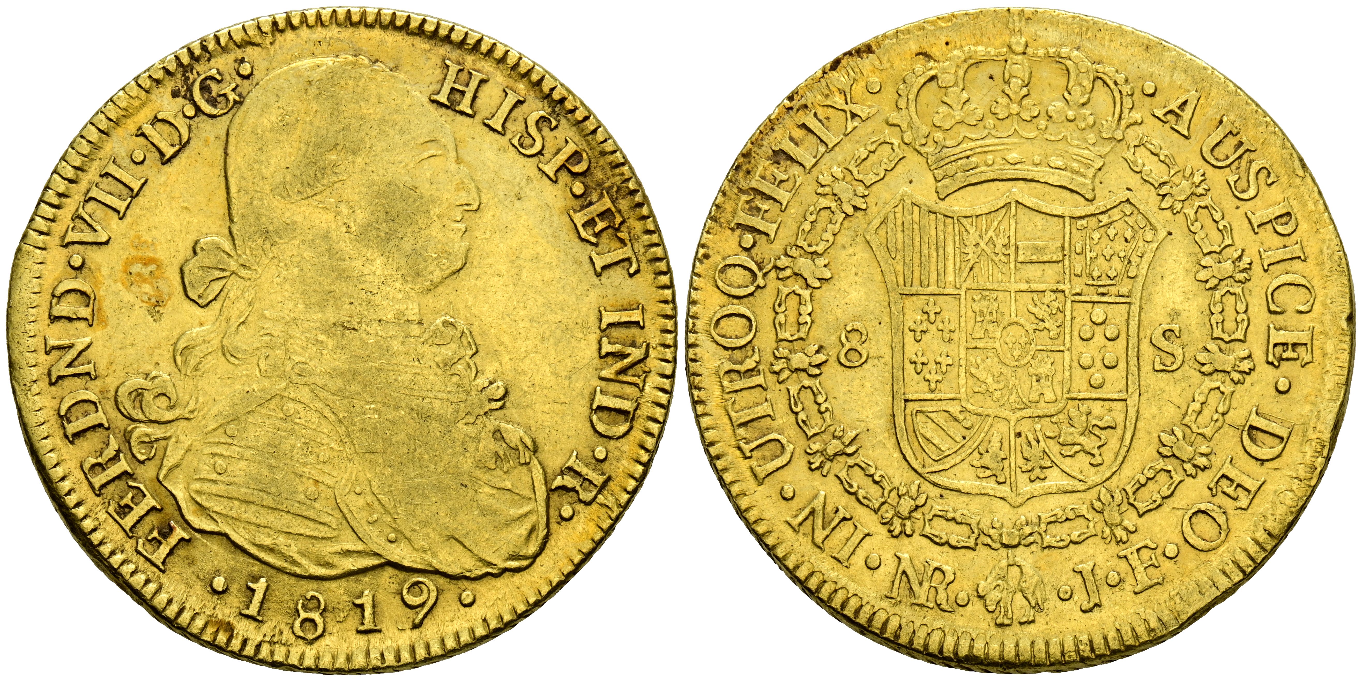 FERDINAND VII (1808-1833). 8 Escudos. (Au. 26.97g/37mm). 1819. New Kingdom JF. (Cal-2109-1857). Very Fine.