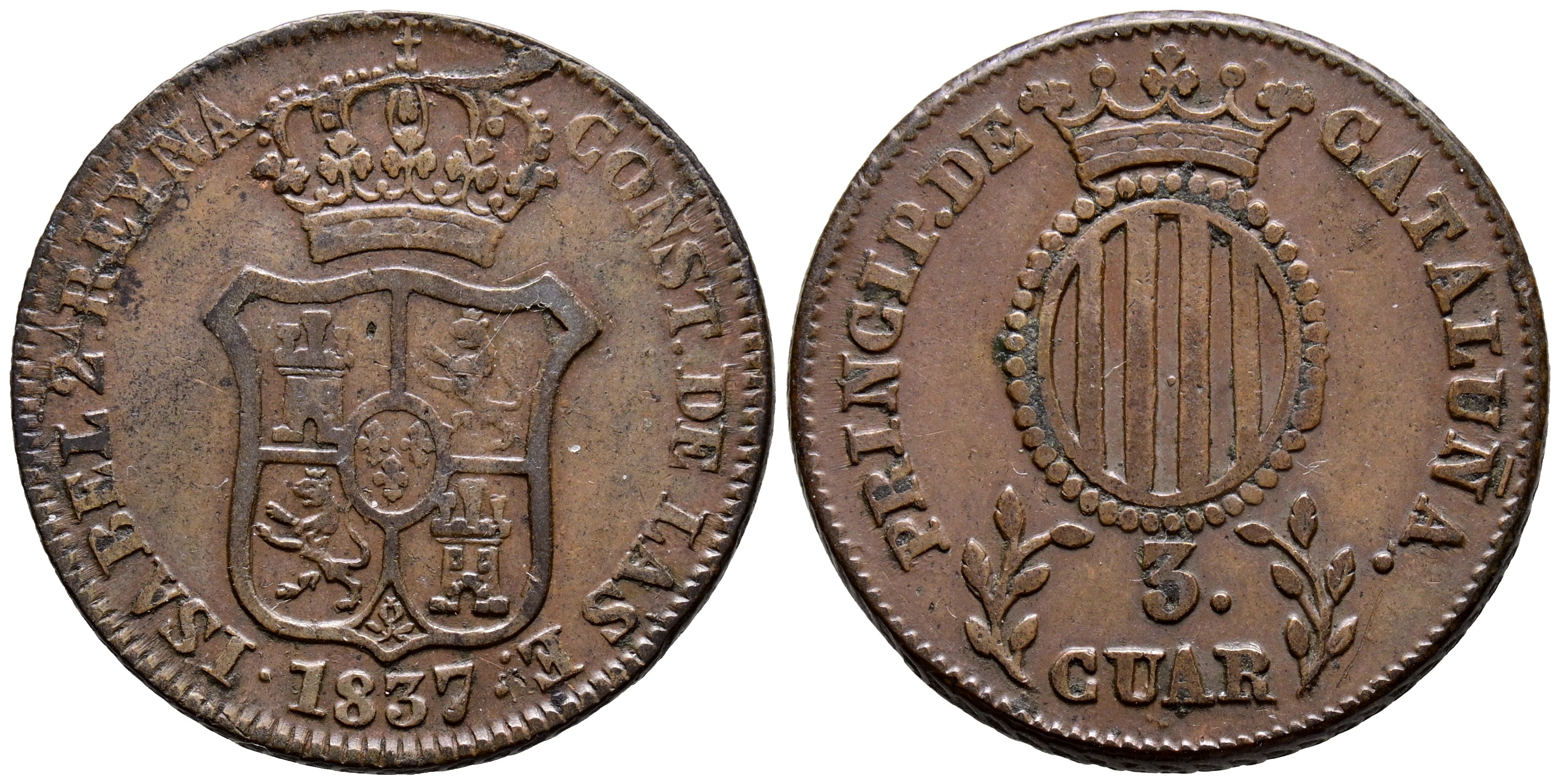 ELIZABETH II (1833-1868). 3 Cuartos. (Ae. 7.68g /26mm). 1837. Barcelona. (Cal-2019-5). Good Very Fine.