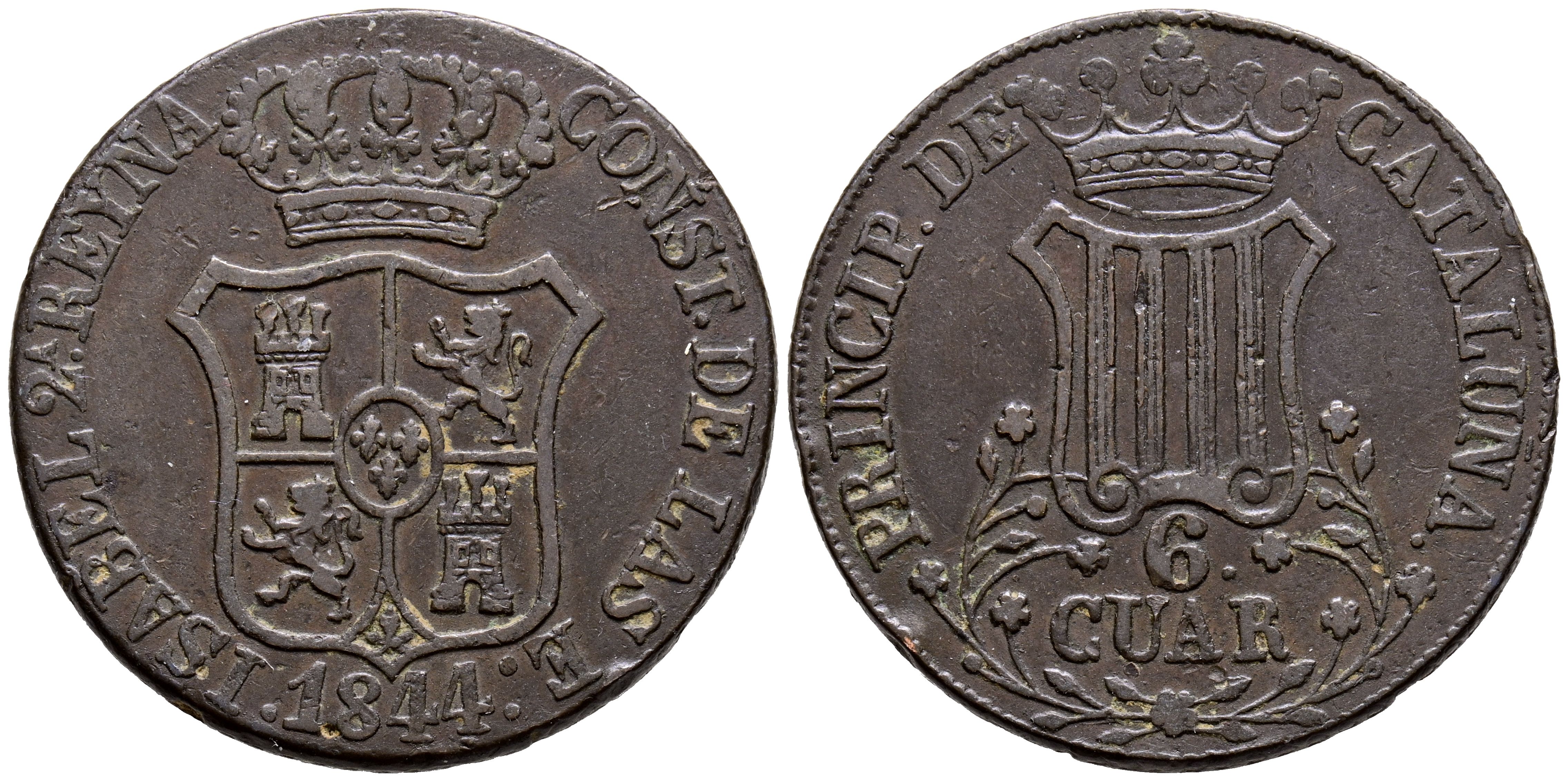 ELIZABETH II (1833-1868). 6 Cuartos (Ae. 13.15g/32mm). 1844. Barcelona. (Cal-2019-26). Very Fine.