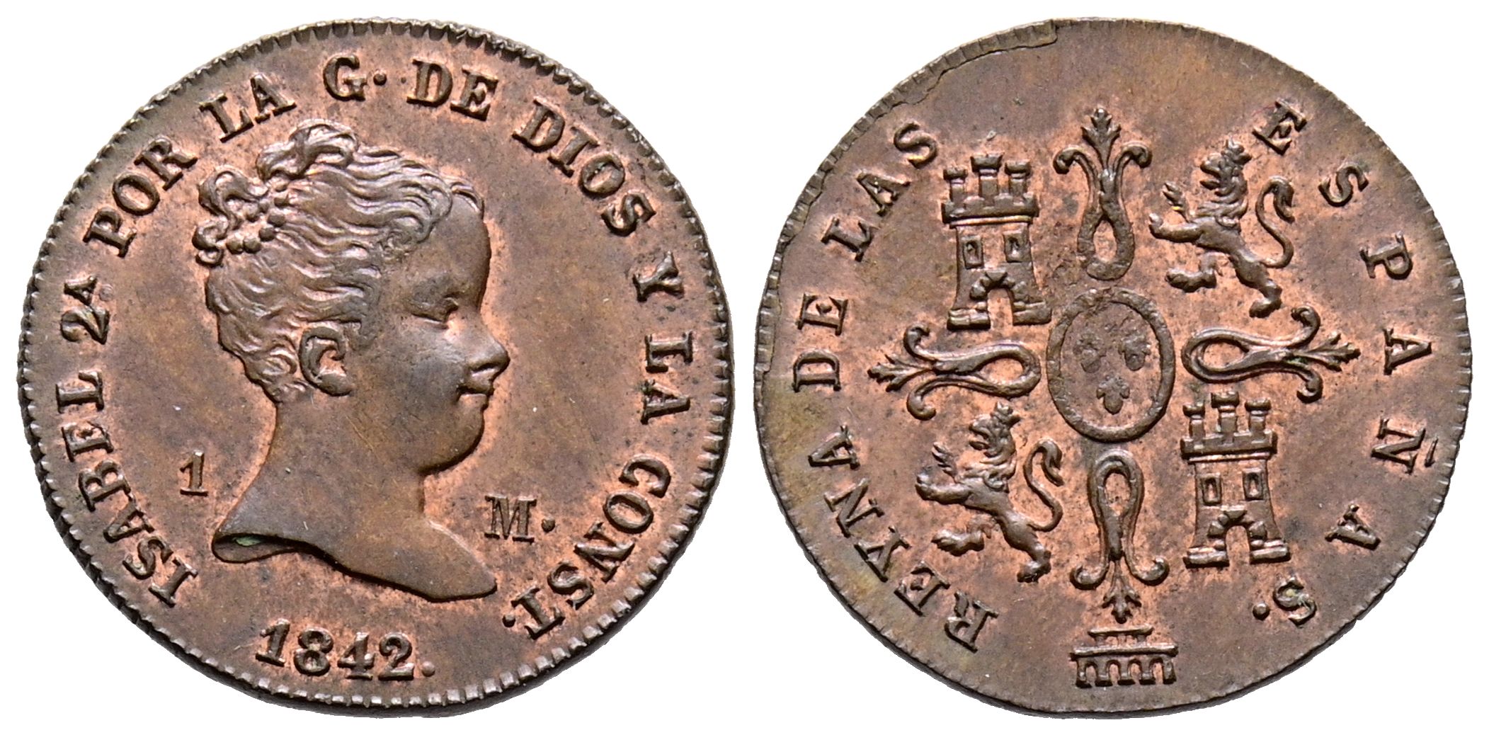 ELIZABETH II (1833-1868). 1 Maravedi. (Ae. 1.00g/15mm). 1842. Segovia. (Cal-2019-35). Almost Uncirculated. Beautiful specimen presenting traces of original shine, scarce as it is.