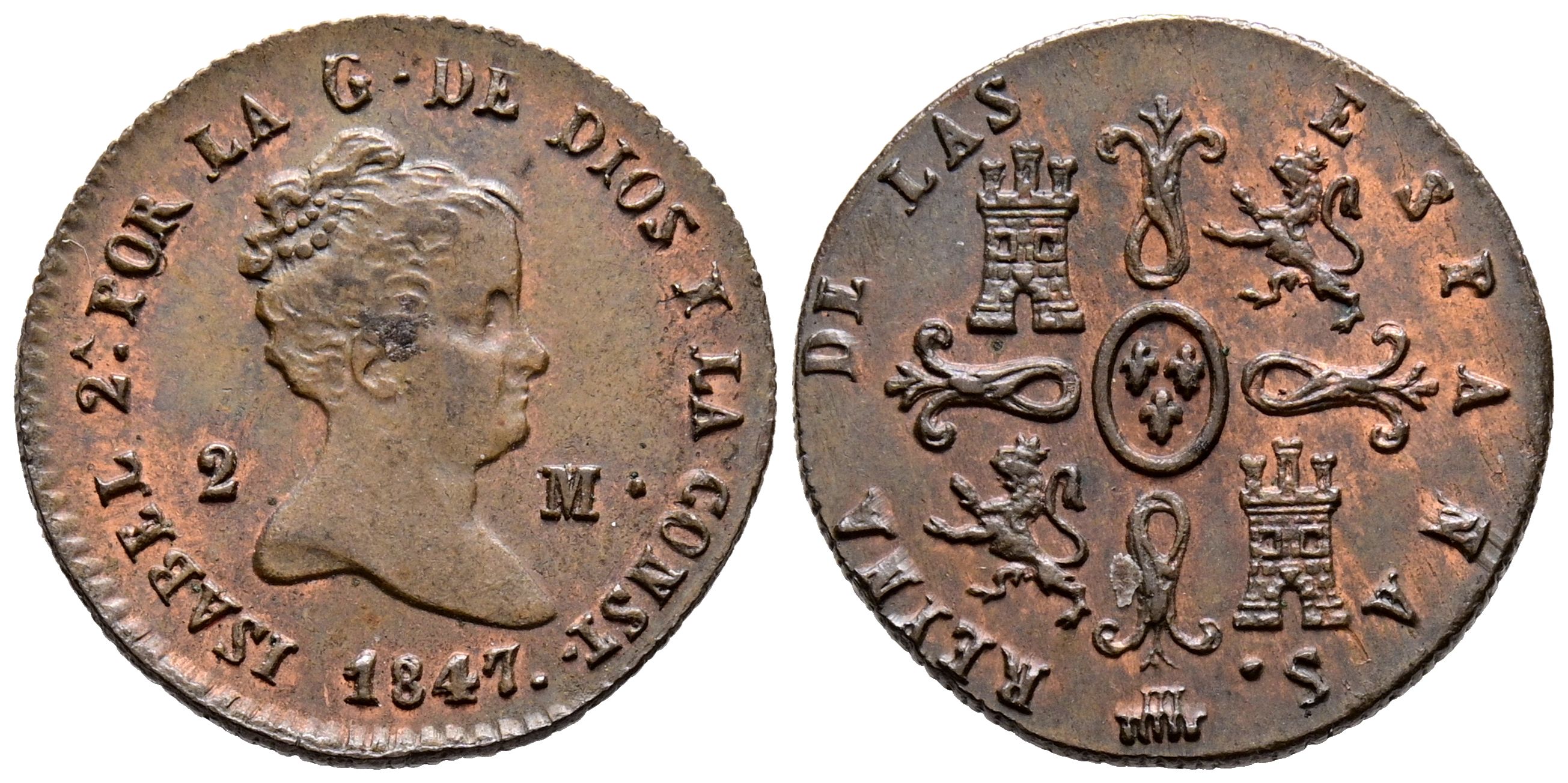 ELIZABETH II (1833-1868). 2 Maravedís (Ae. 2.09g/18mm). 1847. Segovia. (Cal-2019-59). Good Extremely Fine.