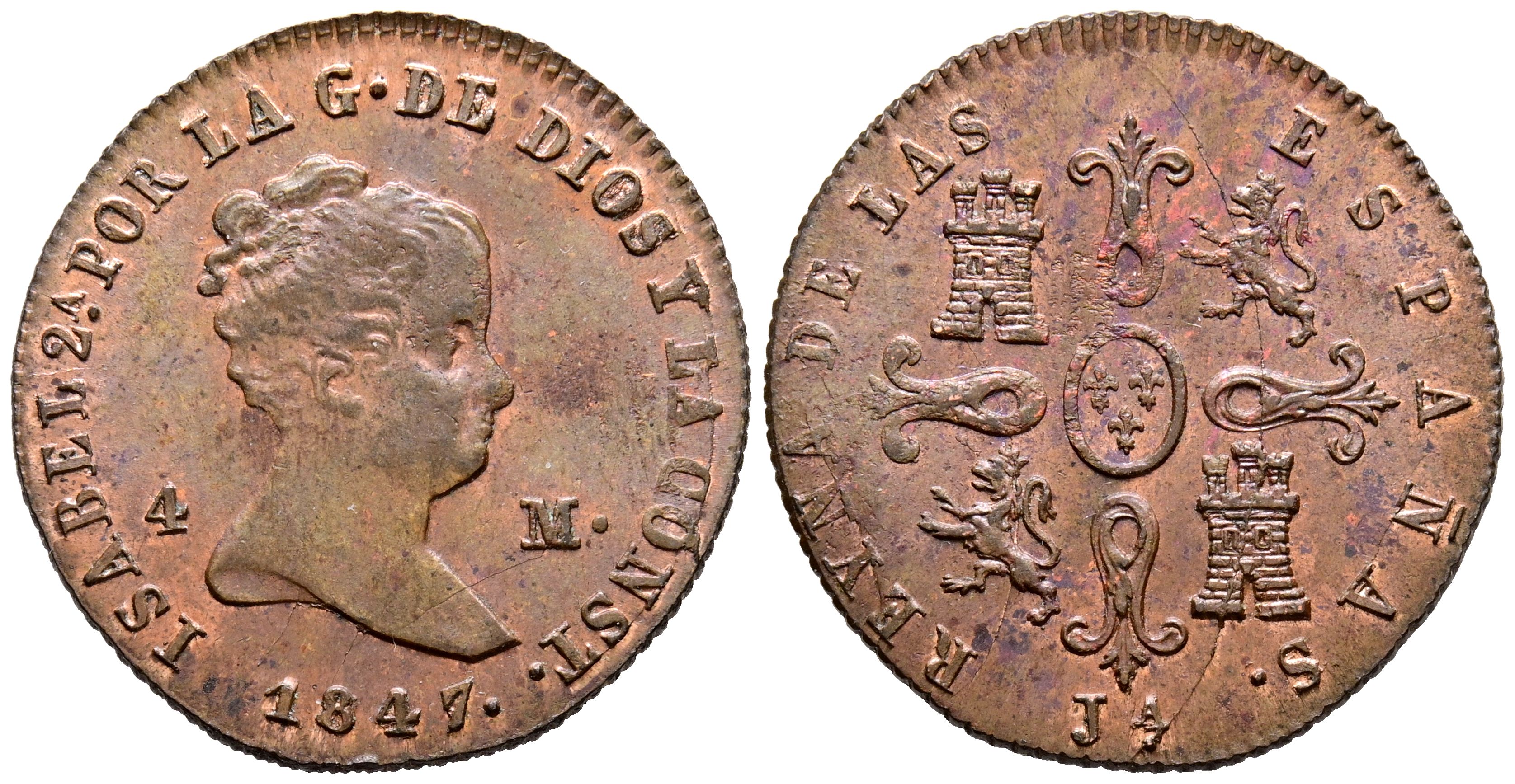 ELIZABETH II (1833-1868). 4 Maravedis. (Ae. 4.43g/23mm). 1847. Jubia. (Cal-2019-73). Almost Uncirculated. Die breakage on both obverse and reverse. Remnants of original shine.