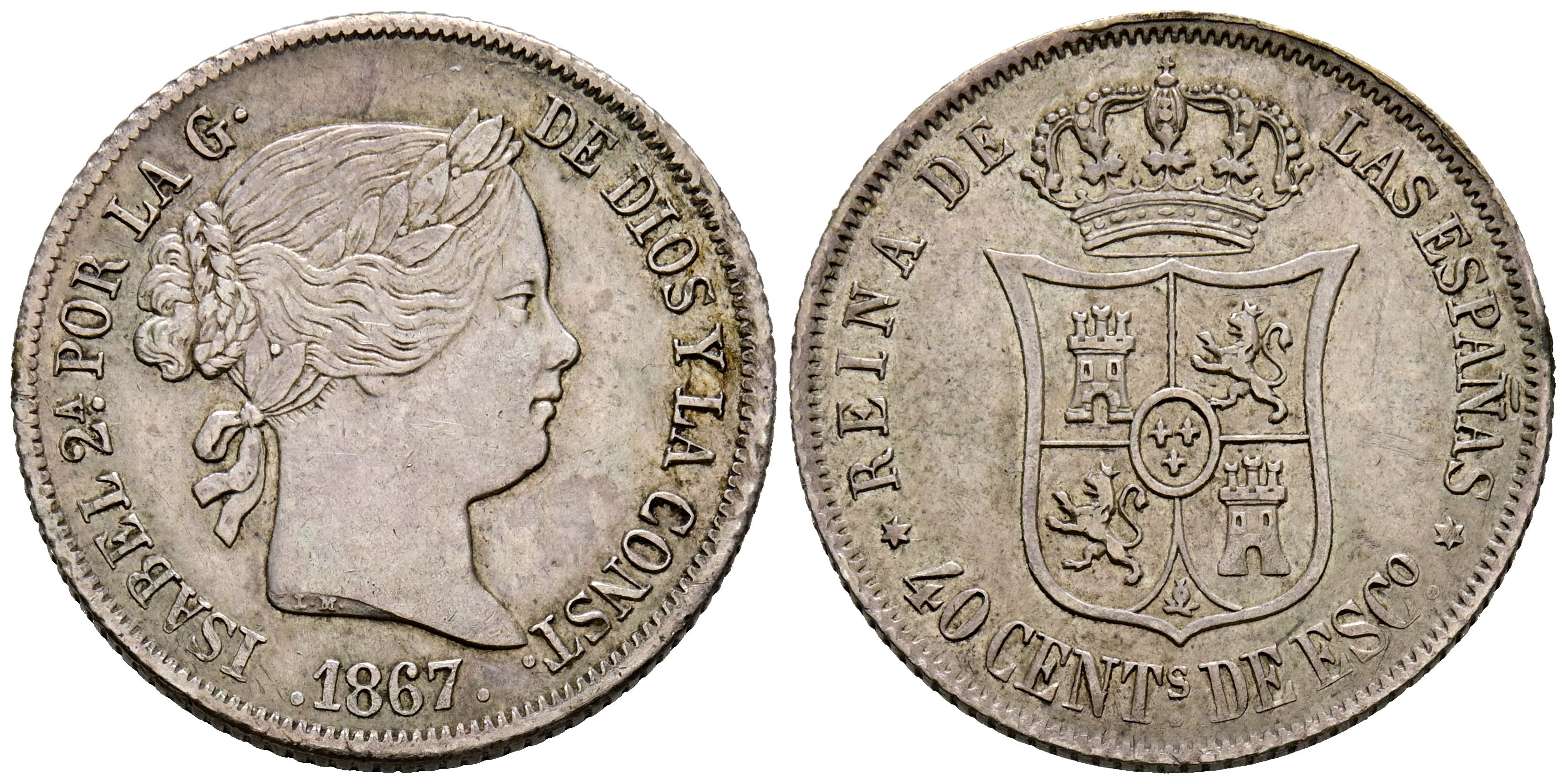 ELIZABETH II (1833-1868). 40 Céntimos de Escudo. (Ar. 5.11g/23mm). 1867. Madrid. (Cal-2019-502). Good Very Fine.
