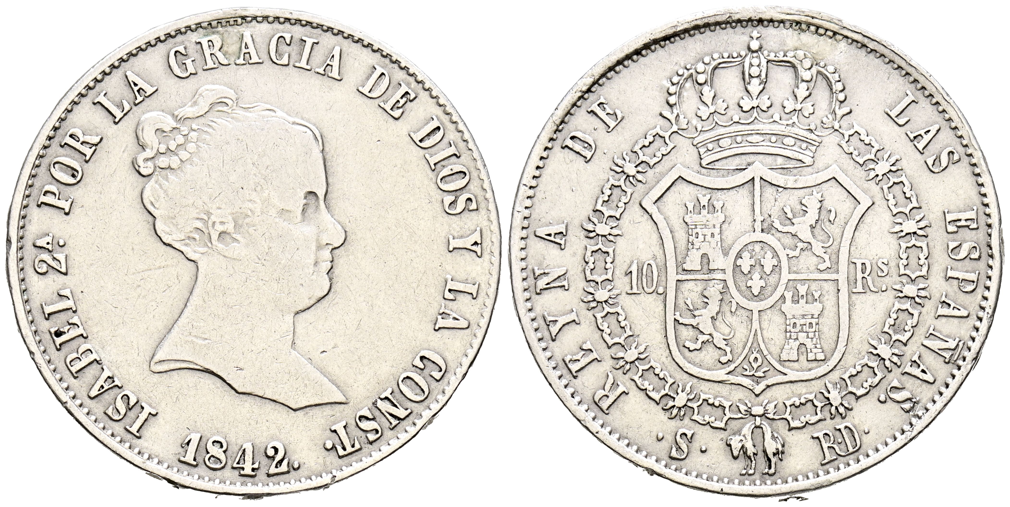 ELIZABETH II (1833-1868). 10 Reales. (Ar. 13.35g/29mm). 1842. Sevilla DR. (Cal-2019-543). Very Fine. Small perforation repaired at 12 noon. Limited.