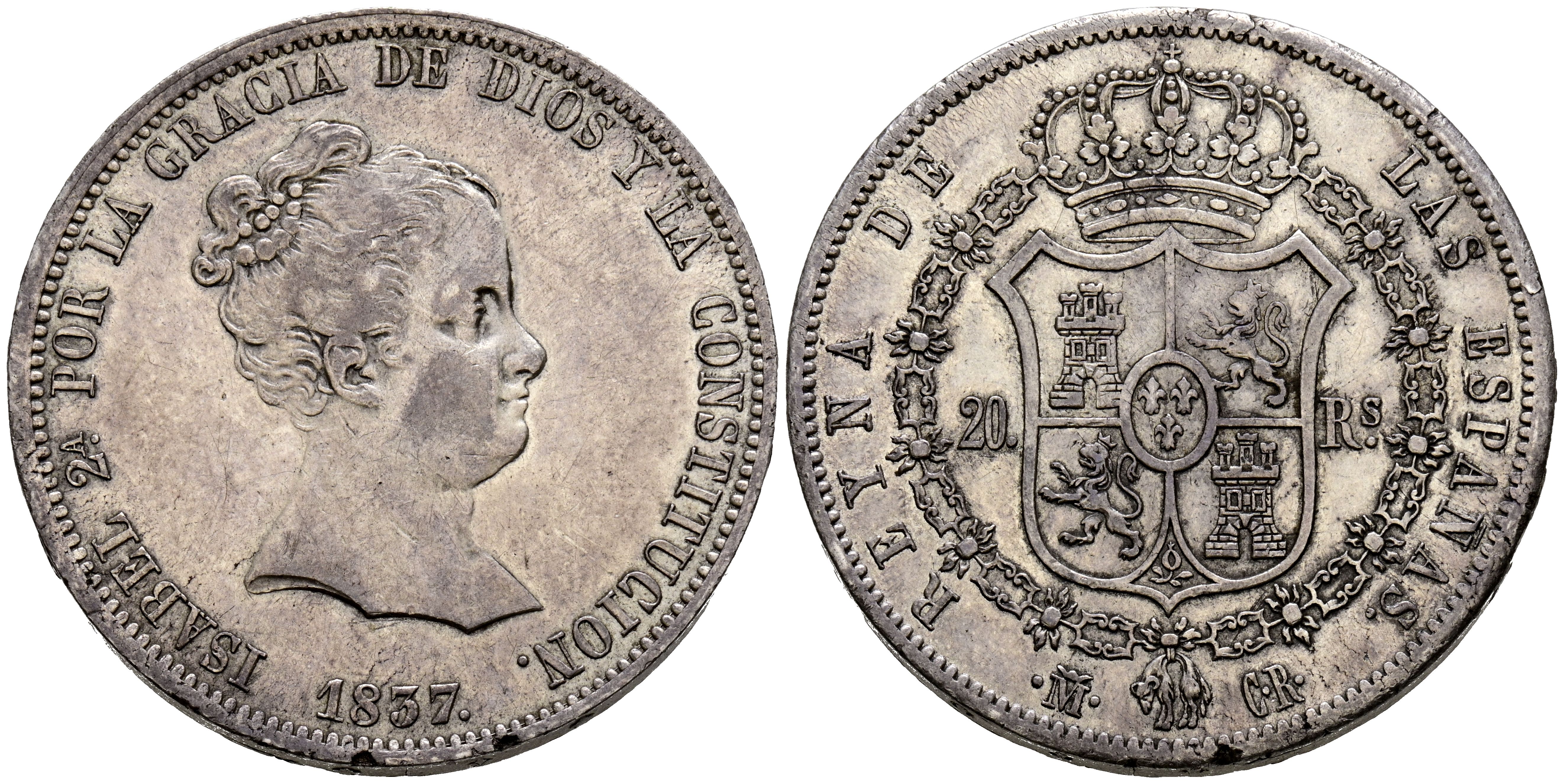 ELIZABETH II (1833-1868). 20 Reales (Ar. 26.94g/37mm). 1837. Madrid CR (Cal-2019-581). Constitution on reverse. Very Fine. Nice tone. Strange.