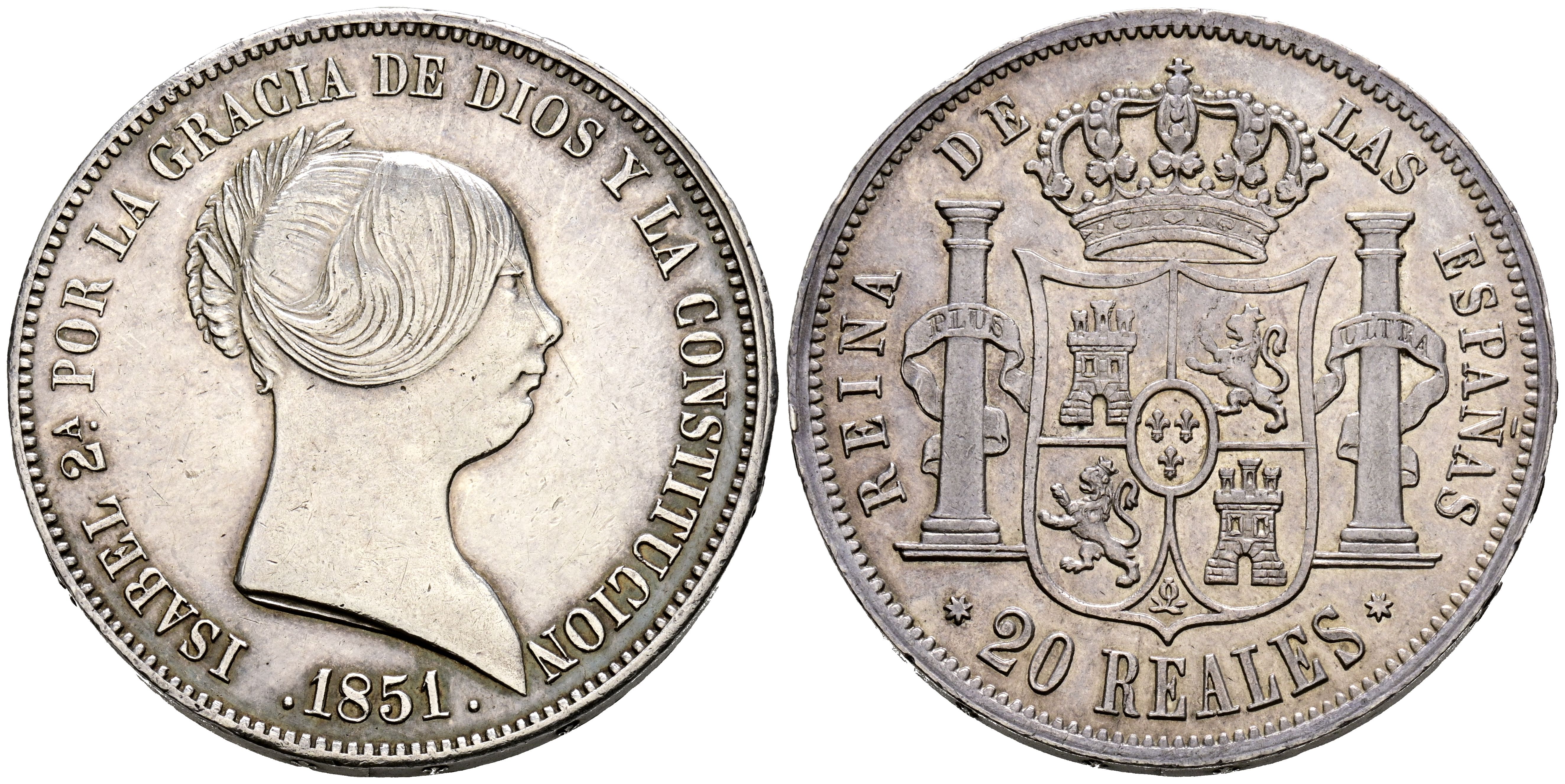 English ELIZABETH II (1833-1868). 20 Reales (Ar. 25.89g /37mm). 1851. Sevilla. (Cal-2019-626). Good Very Fine/ Almost Extremely Fine. Cleaned. Strange.