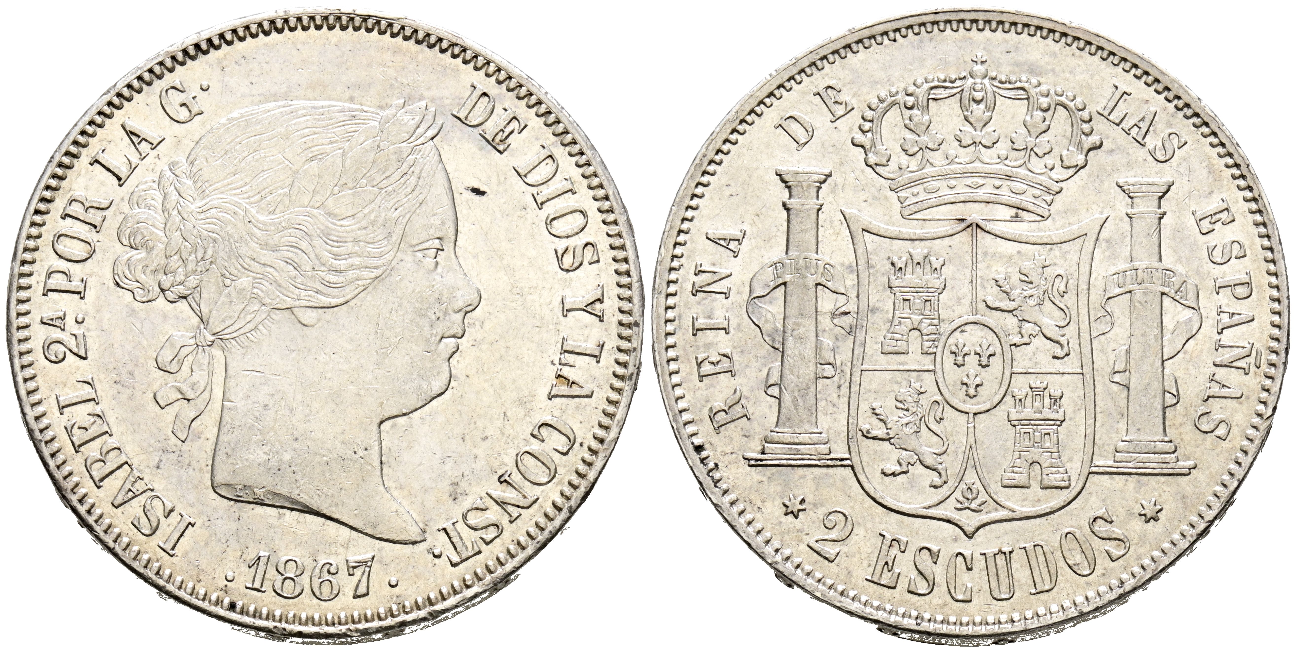 ISABEL II (1833-1868). 2 Escudos. (Ar. 25,83g/37mm). 1867. Madrid. (Cal-2019-647). EBC. Marquitas. Ligeros restos de brillo original.