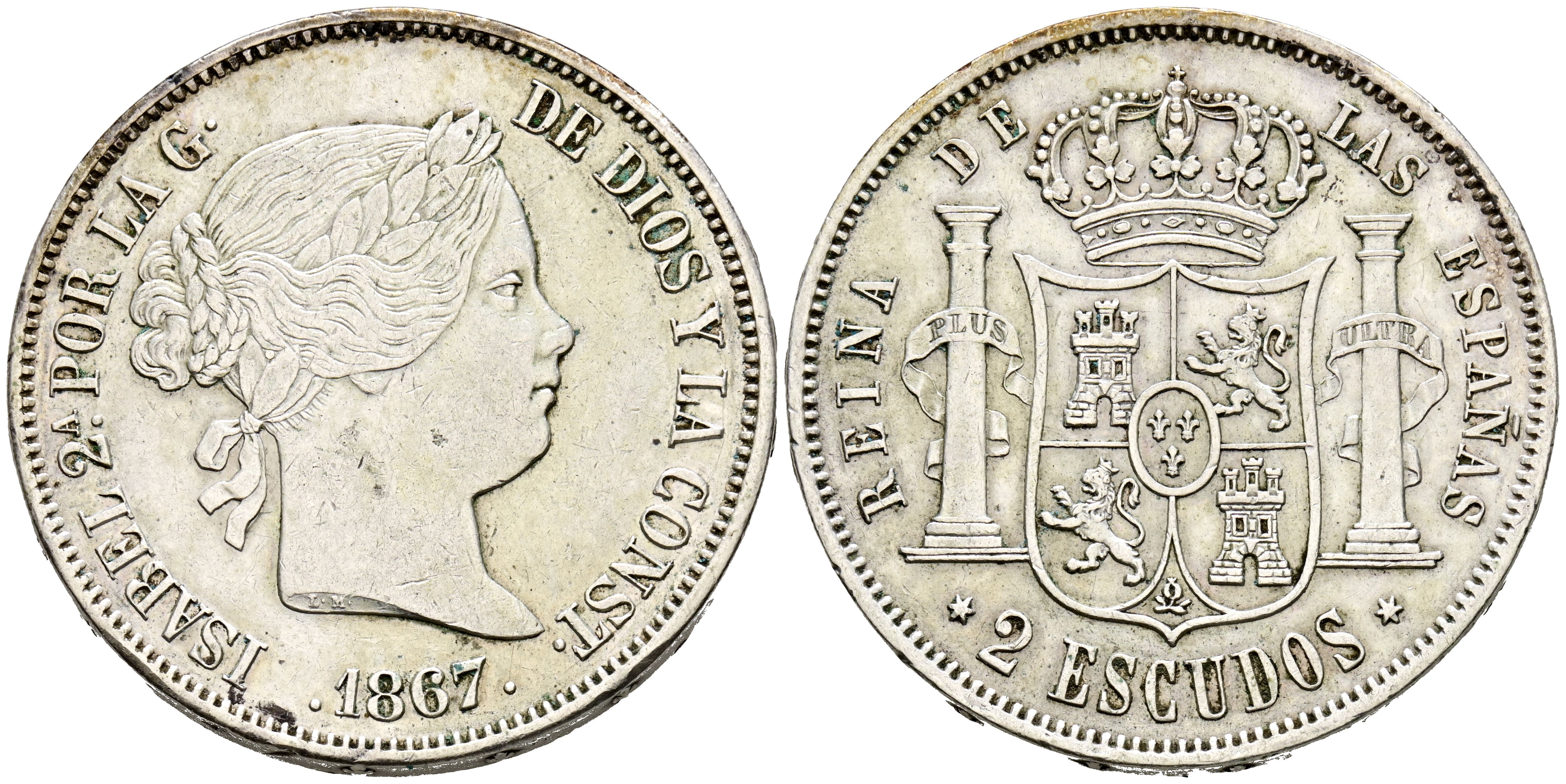 ISABEL II (1833-1868). 2 Escudos. (Ar. 26,04g/37mm). 1867. Madrid. (Cal-2019-647). MBC+.
