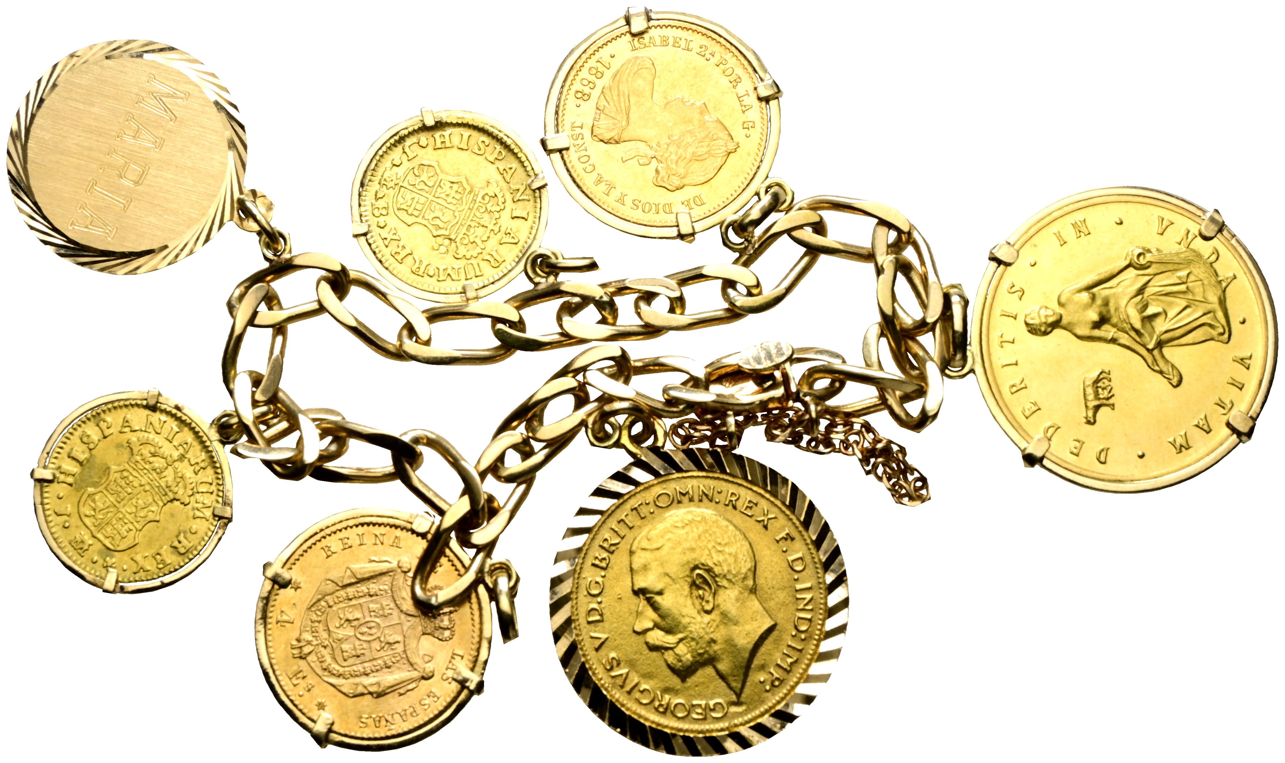 Gold bracelet with 7 pieces (coins and medals) set where we find both Spanish and foreign specimens of different modules and dates. Total weight of the gold set: 41.03g. Total purity of the whole according to densimeter: 0.780 thousandths. Original pieces and jewelry alternate in the set. Different states of conservation. TO EXAMINE.