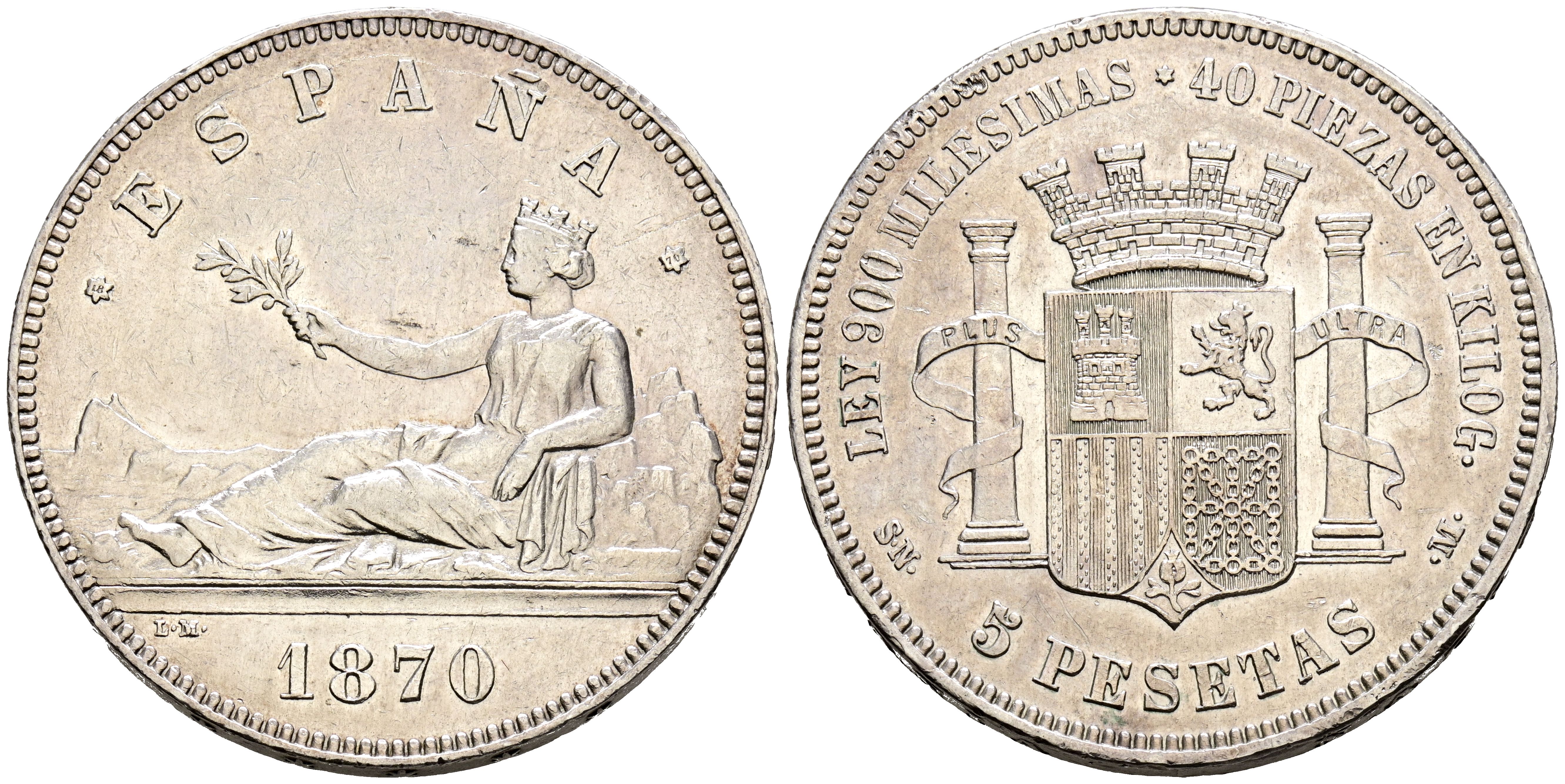PROVISIONAL GOVERNMENT (1868-1871). 5 Pesetas. (Ar. 24.75g/37mm). 1870 *18-70. Madrid SNM. (Cal-2019-39). Good Very Fine. Cleaned.