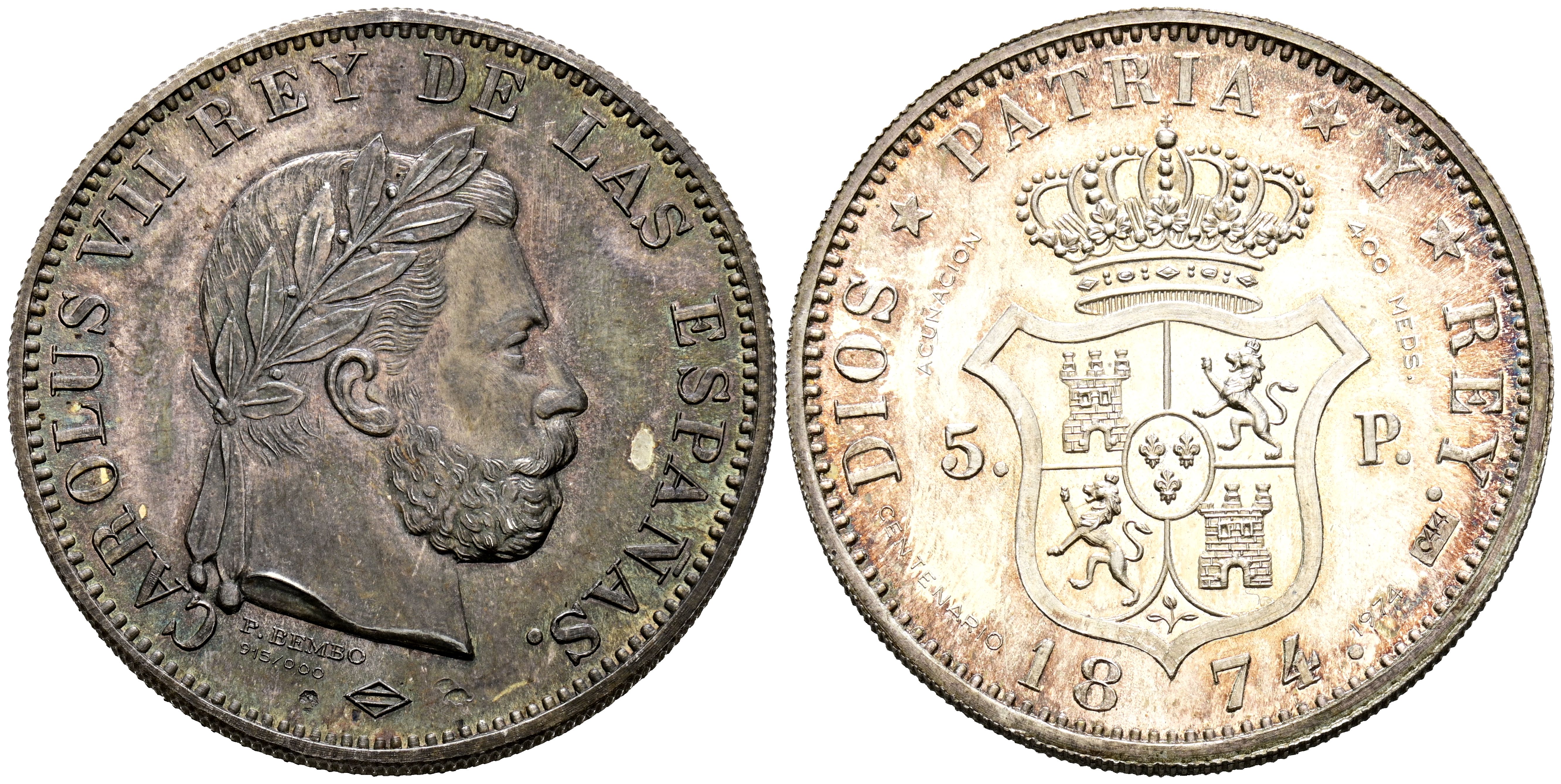 CARLOS VII (1868-1909). 5 Pesetas (Ar. 24.90g/38mm). 1874. Reproduction from 1974 on the occasion of its centenary. 400 minted copies (No. 044). Good Extremely Fine. Nice patina.