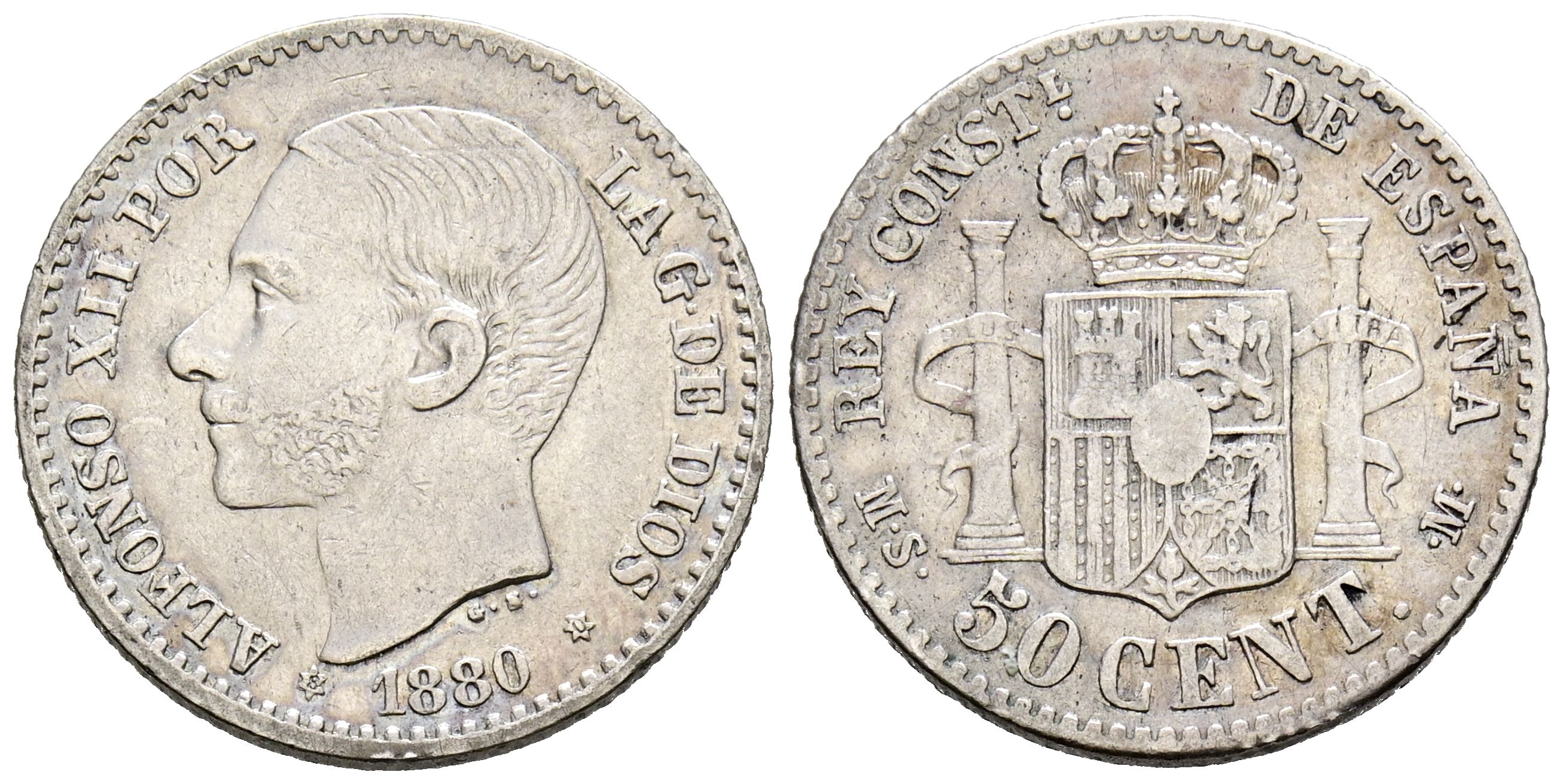 ALFONSO XII (1874-1885). 50 Cents (Ar. 2.43g/18mm). 1880 *80. Madrid MSM. (Cal-2019-11). Good Very Fine.