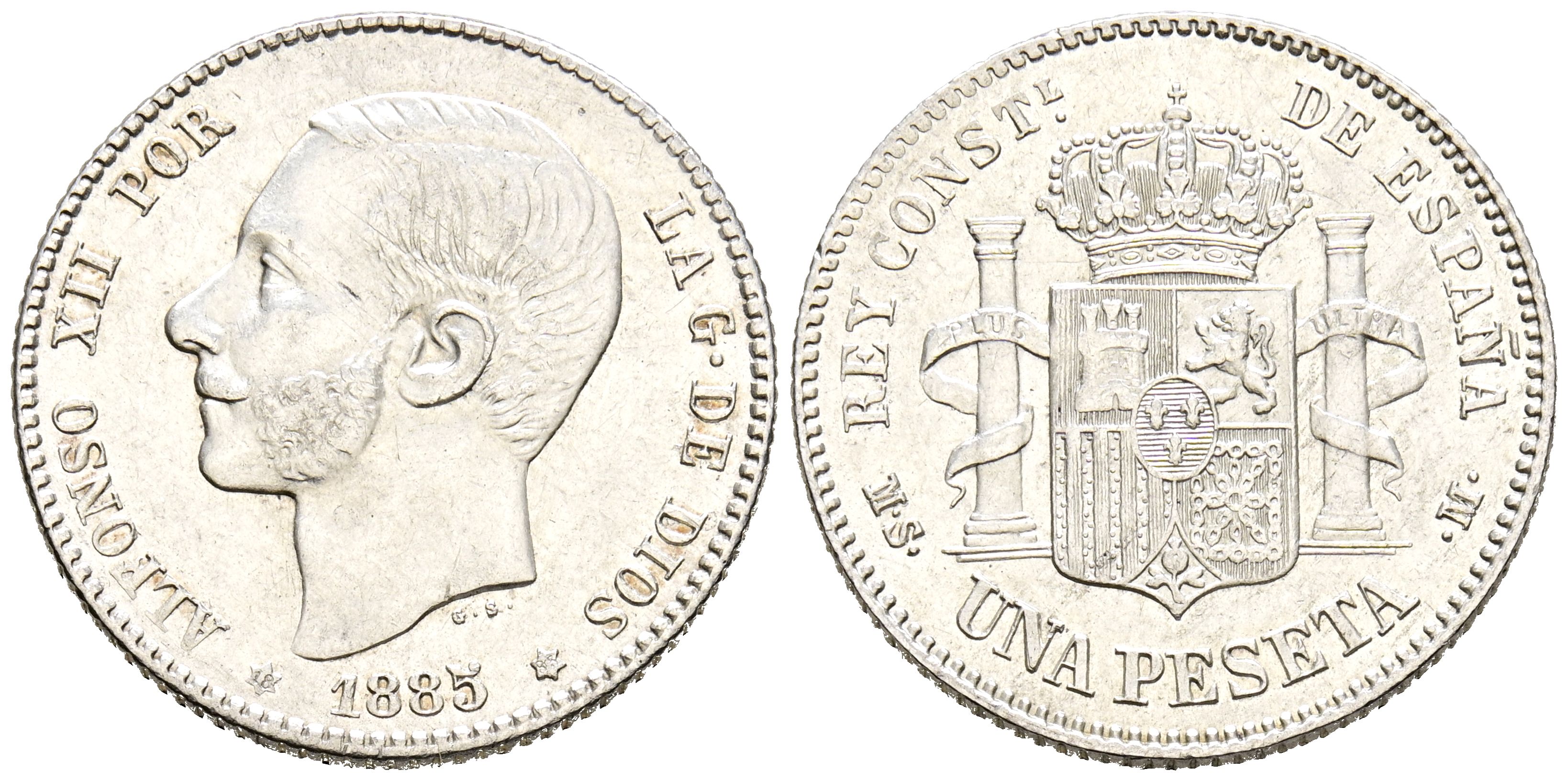 ALFONSO XII. (1874-1885). 1 Peseta (Ar. 5.11g/23mm). 1885 *18-85. Madrid MSM. (Cal-2019-24). Good Very Fine. Limited.