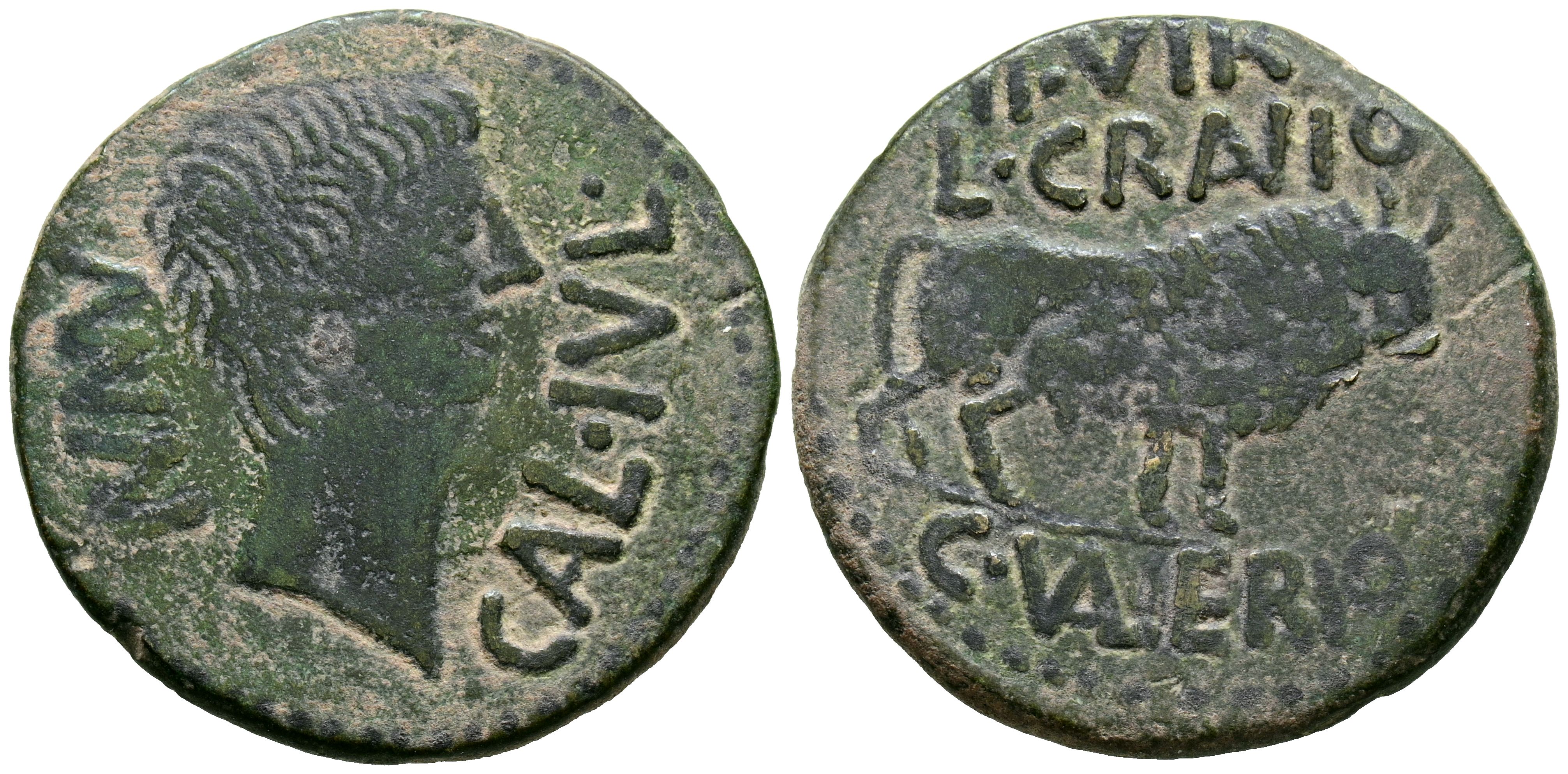 CALAGURRIS (Calahorra, La Rioja). As. (Ae. 12.39g/30mm). 27 BC-14 AD (FAB-406). Anv: Head of Augustus to the right, around legend: MVN CAL IVL. Rev: Bull to the right, around legend: II VIR L CRANIO. Almost Very Fine. Enhanced.