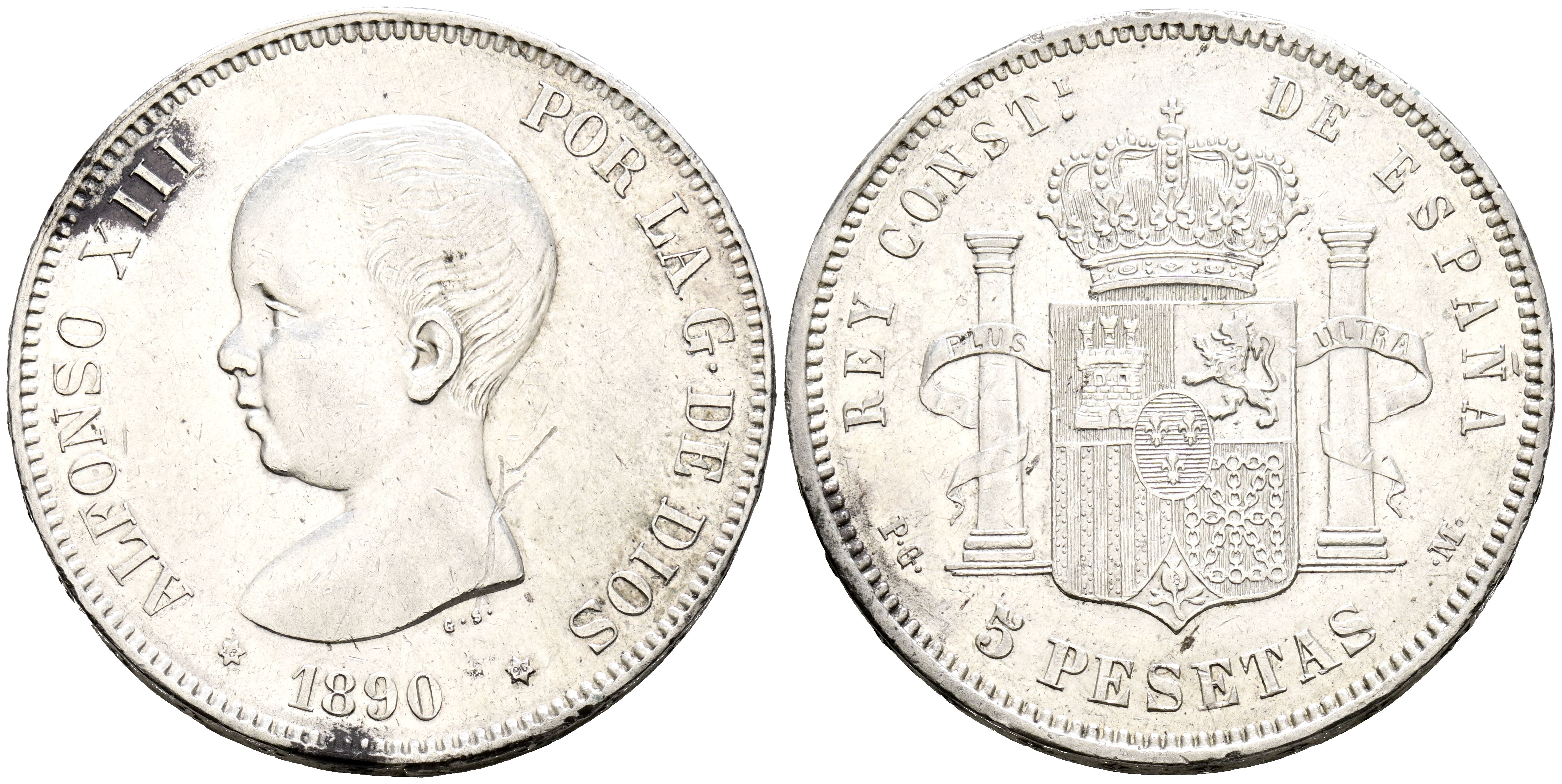ALFONSO XIII (1885-1931). 5 Pesetas. (Ar. 24.96g/37mm). 1890 *18-90. Madrid PGM. (Cal-2019-97). Good Very Fine. Cleaned.