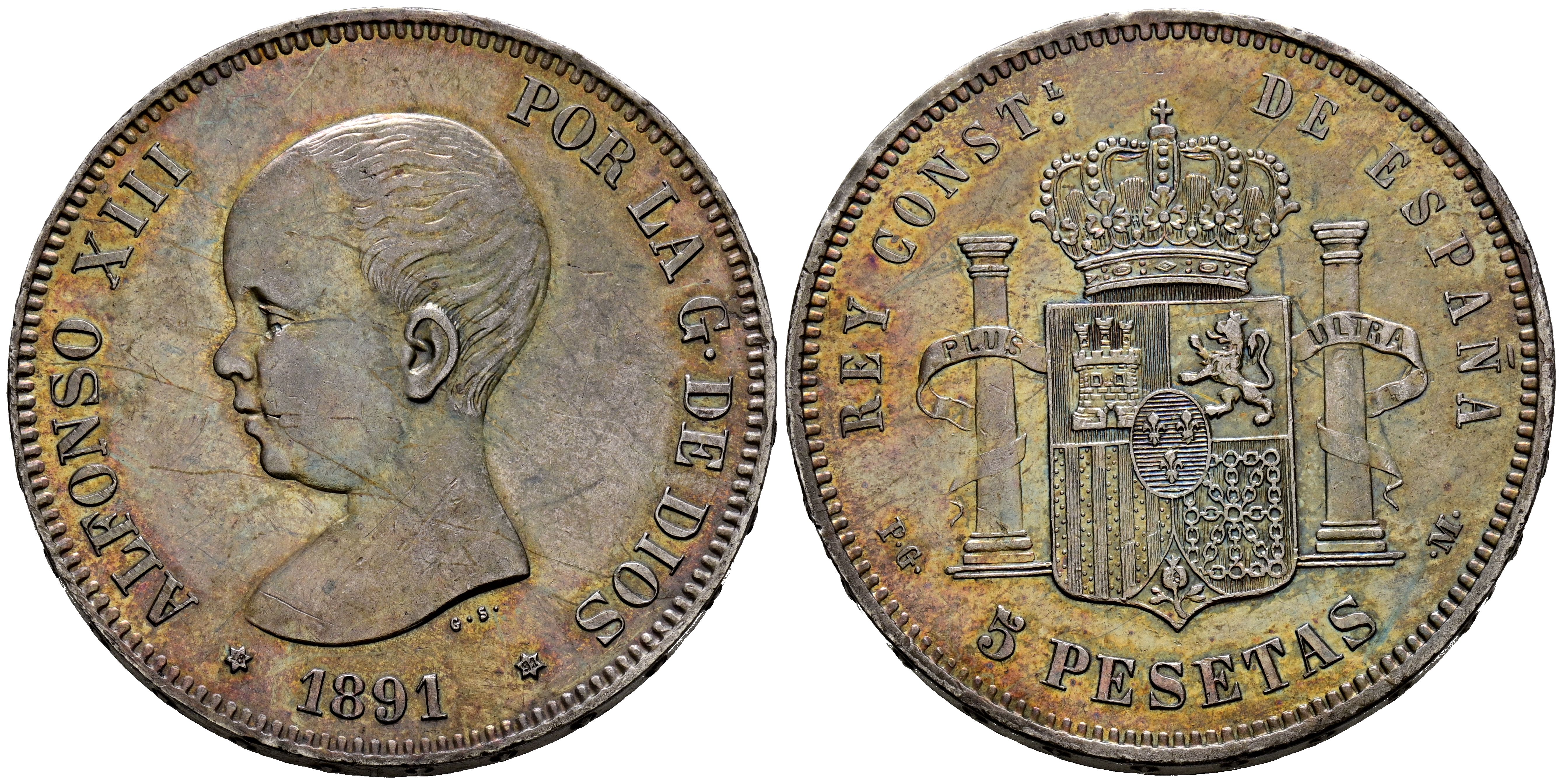 ALFONSO XIII (1885-1931). 5 Pesetas. (Ar. 25.04g/37mm). 1891 *18-91. Madrid PGM. (Cal-2019-98). Almost Extremely Fine. Beautiful iridescent patina.