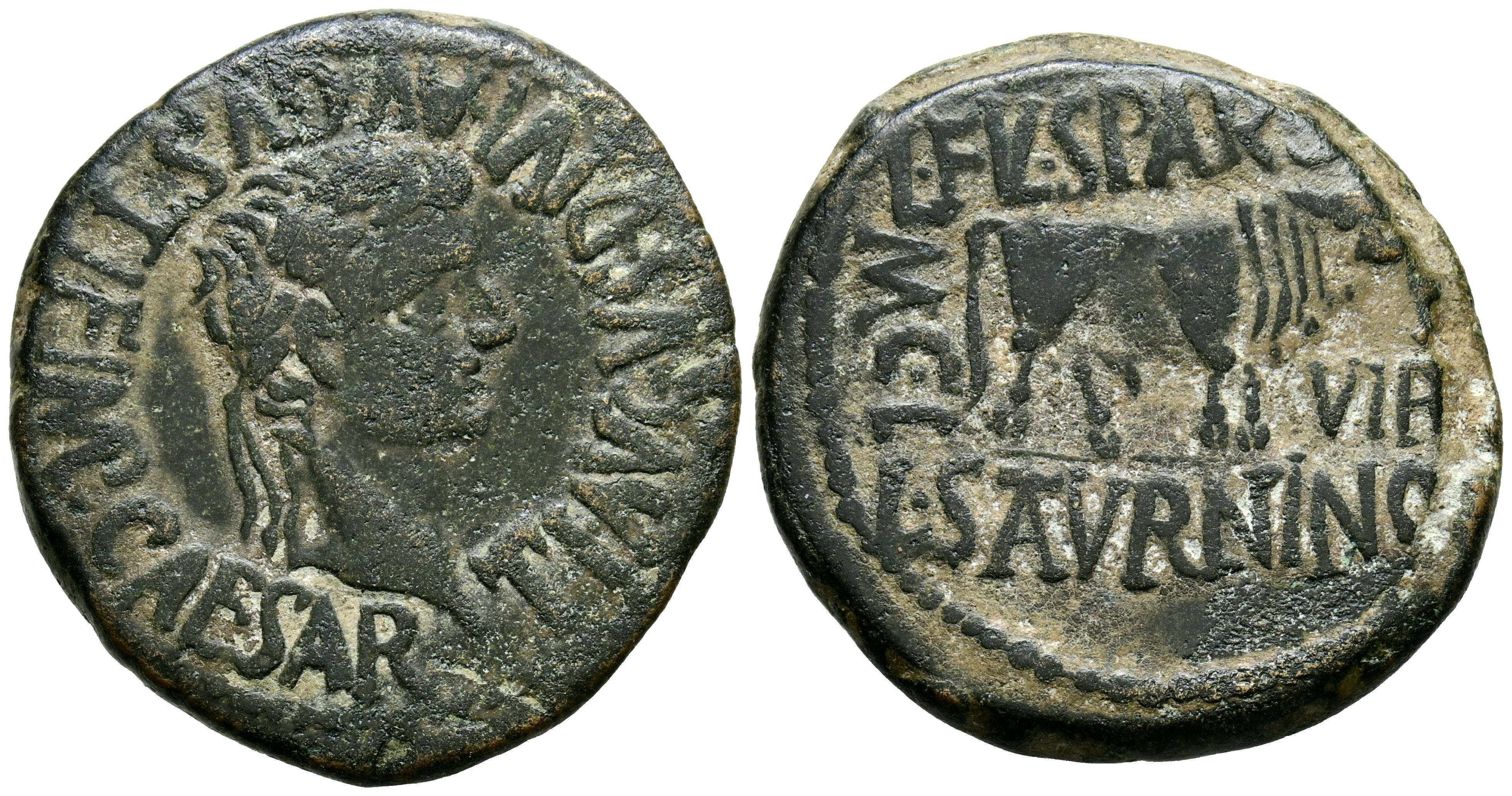 CALAGURRIS (Calahorra, La Rioja). As. (Ae. 12.66g/29mm). 14-36 AD (FAB-429). Anv: Laureate head of Tiberius to the right, around legend: TI AVGVS DIVI AVGVSTI F IMP CAESAR. Rev: Bull to the right, around legend: L FVL SPARSO L SATVRNINO II VIR MCI. Almost Very Fine.