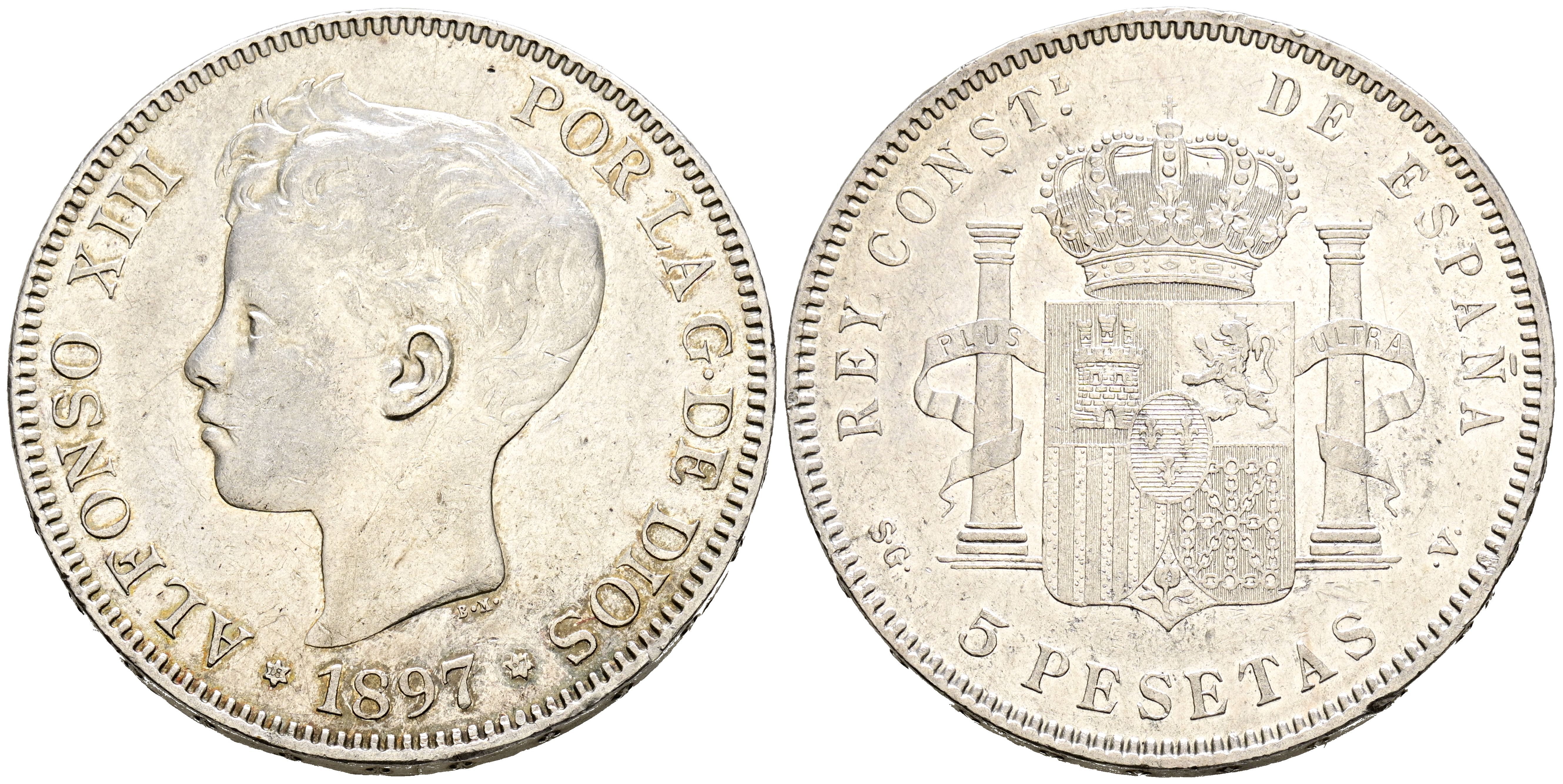 ALFONSO XIII (1885-1931). 5 Pesetas. (Ar. 24.88g/37mm). 1897 *18-97. Madrid SGV. (Cal-2019-107). Good Very Fine. Cleaned.