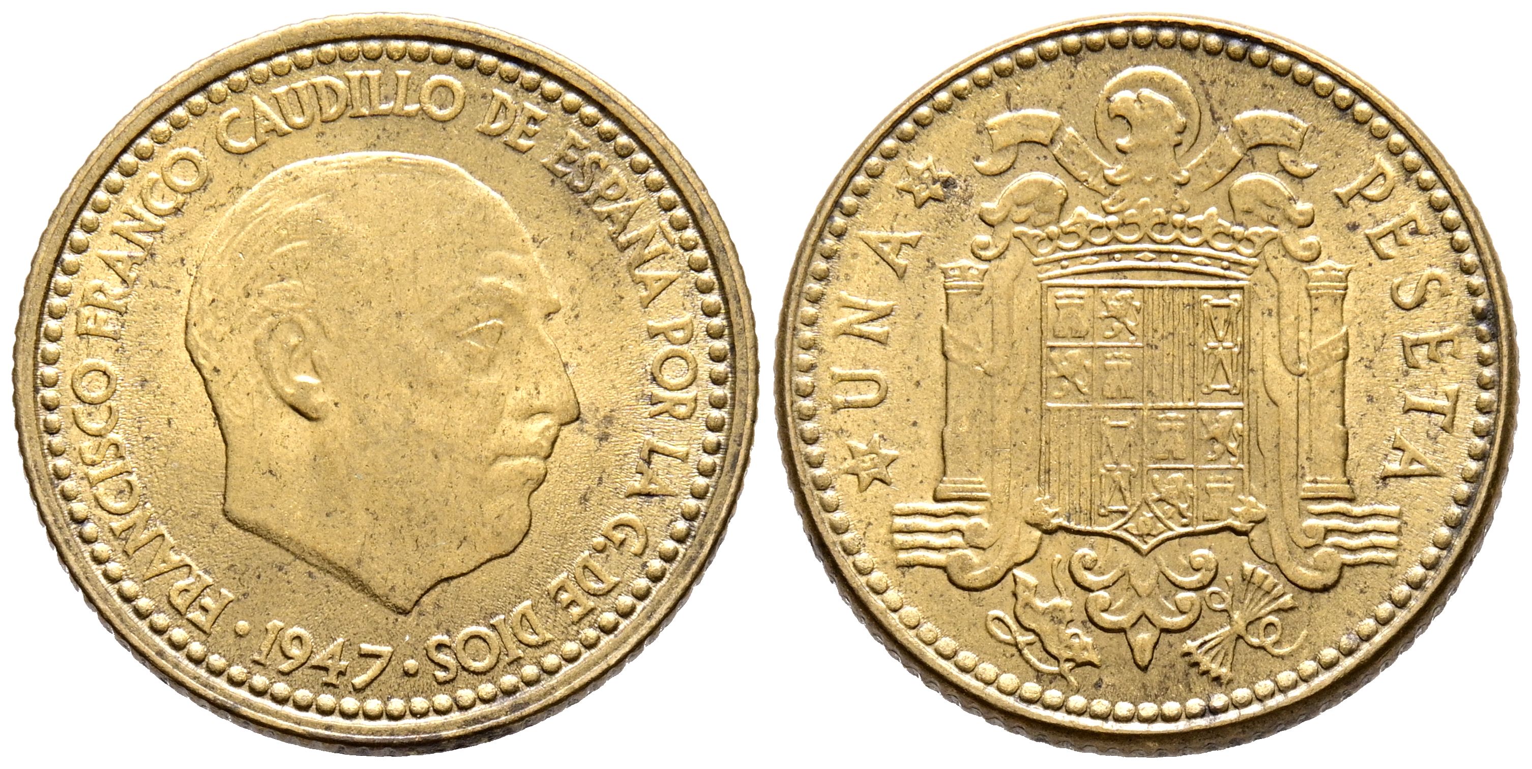 SPANISH STATE (1936-1975). 1 Peseta. (Al-Ae. 3.62g/21mm). 1947 *19-52. Madrid. (Cal-2019-52). Good Extremely Fine.