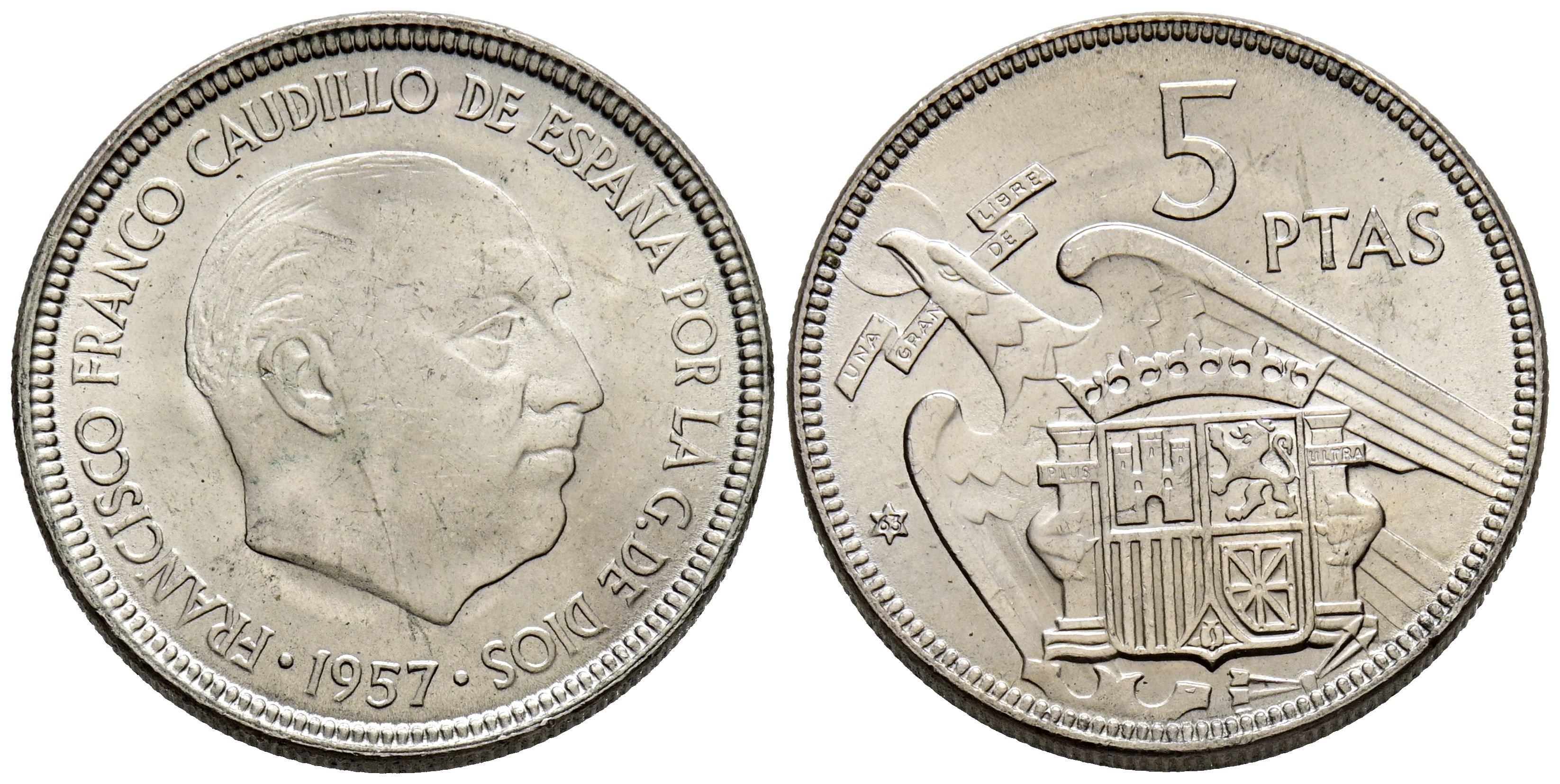 SPANISH STATE (1936-1975). 5 Pesetas. (Ni. 6.00g/23mm). 1957 *63. Madrid. (Cal-2019-103). Almost Uncirculated. Original Luster .