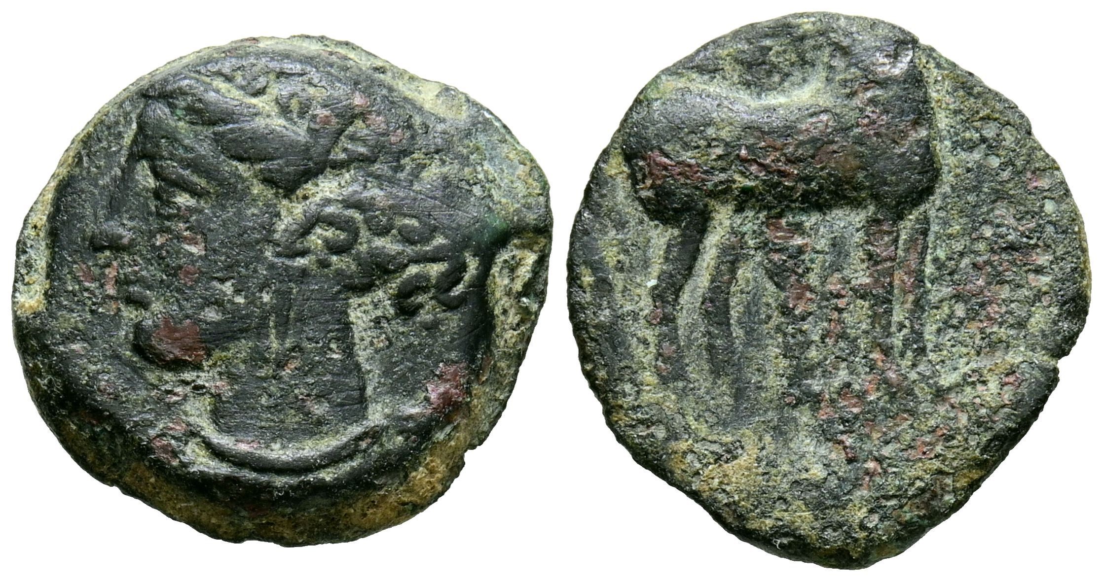 CARTAGONOVA (Cartagena, Murcia). 1/2 Tracing. (Ae. 2.64g/16mm). 220-215 BC (FAB-507). Anv: Head of Tanit to the left. Rev: Horse standing on the right, palm tree behind. Very Fine.