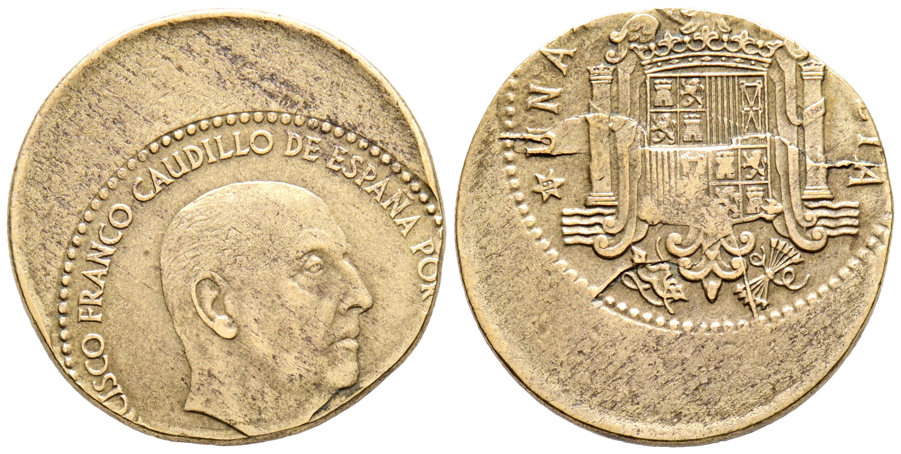 SPANISH STATE (1936-1975). 1 Peseta. (Al-Ae. 3.34g/22mm). 1966 *19-?? Madrid. (Cal-2019-Type 17). Very displaced coinage: 6mm, round edge and various die breaks on the reverse. Very Fine.