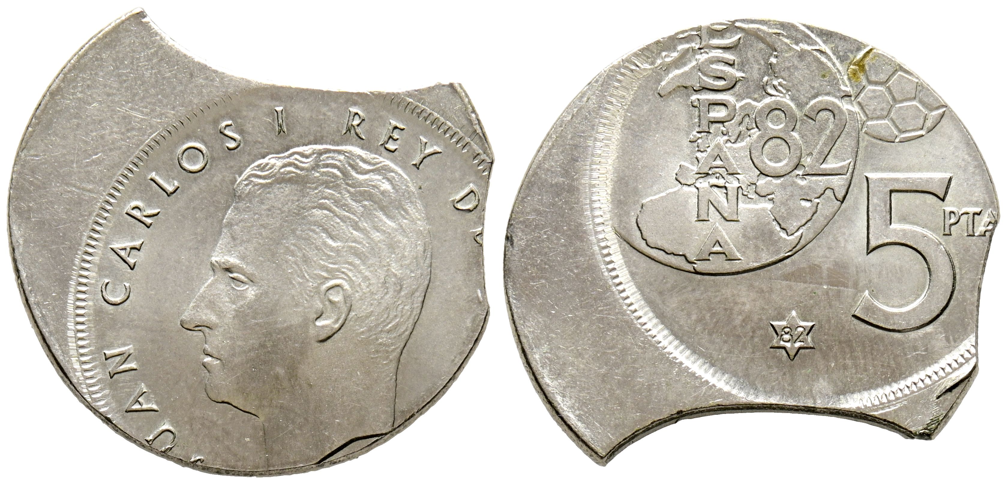 JUAN CARLOS I (1975-2014). 5 Pesetas. (Ae-Ni. 4.86g /24mm). 1980? *82. Madrid. (Cal-2019-43). Offset coinage: 5 mm and double sectioned. Almost Uncirculated.