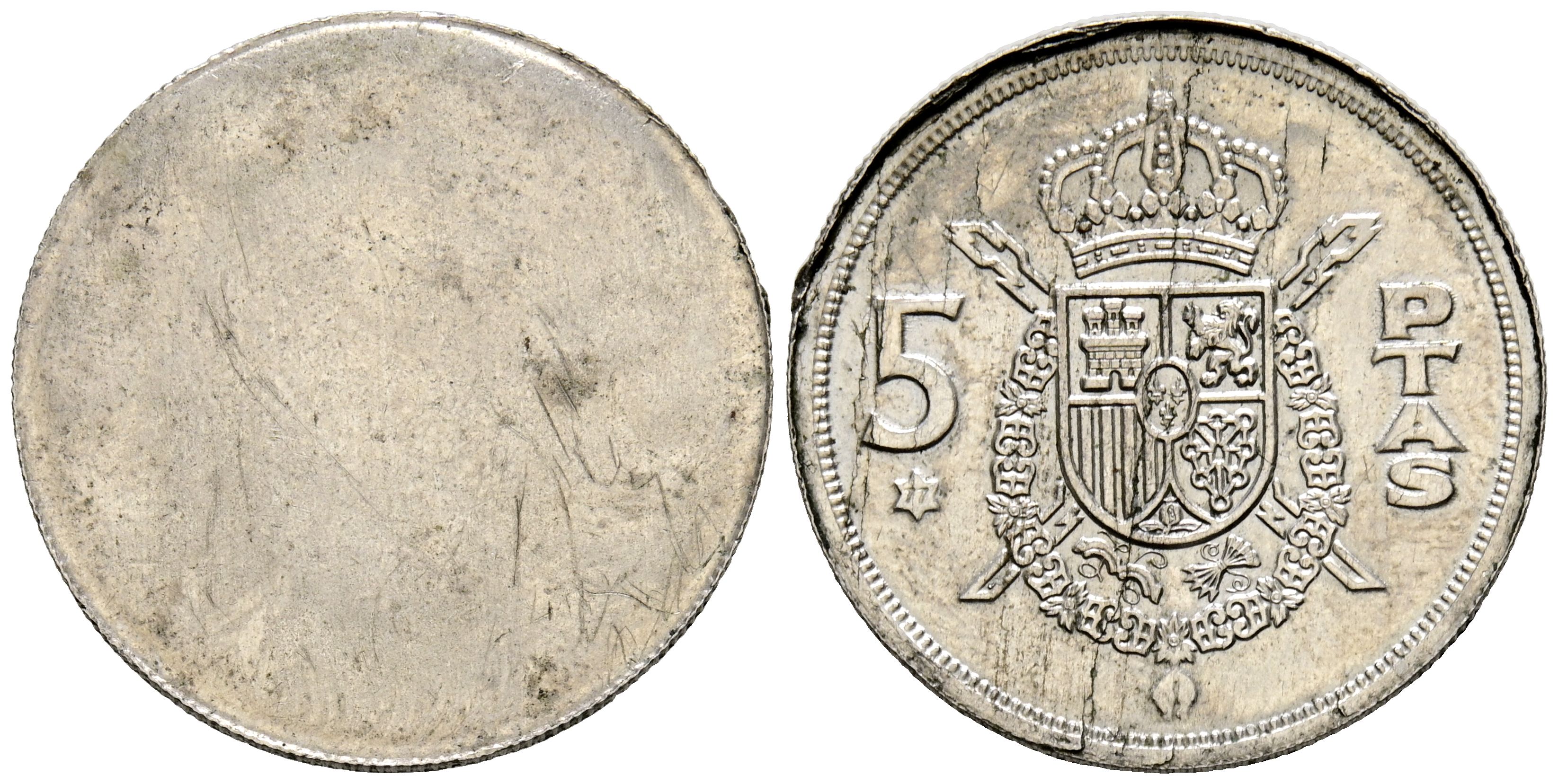 JUAN CARLOS I (1975-2014). 5 Pesetas (Ae-Ni. 2.92g/23mm). 1975 *77. (Cal-2019-36). Uniface coinage. Possible proof. Extremely Fine. Strange