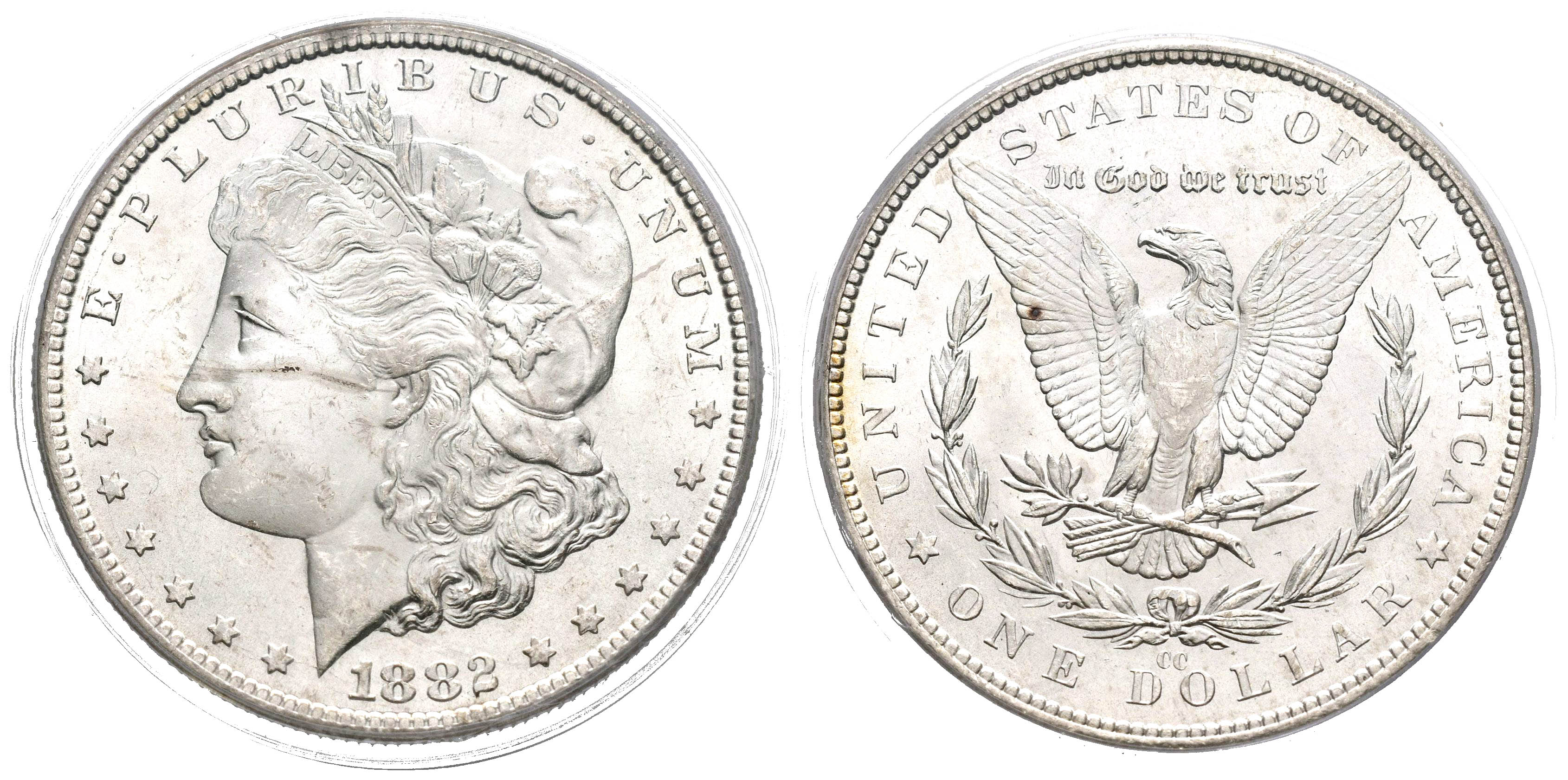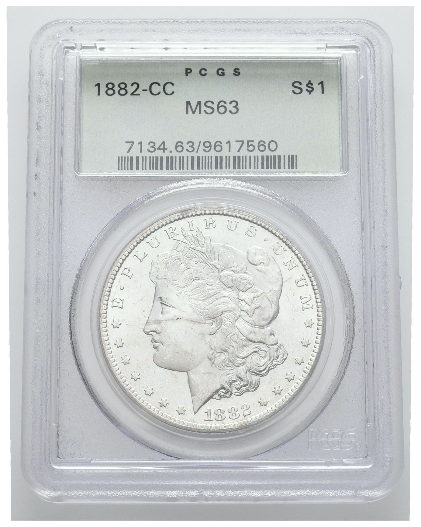 USA. 1 Dollar (Ar. 26.73g/38mm)*. 1882. Carson City CC. (Km#110). Encapsulated by PCGS MS63. *Theoretical weight and measurement.