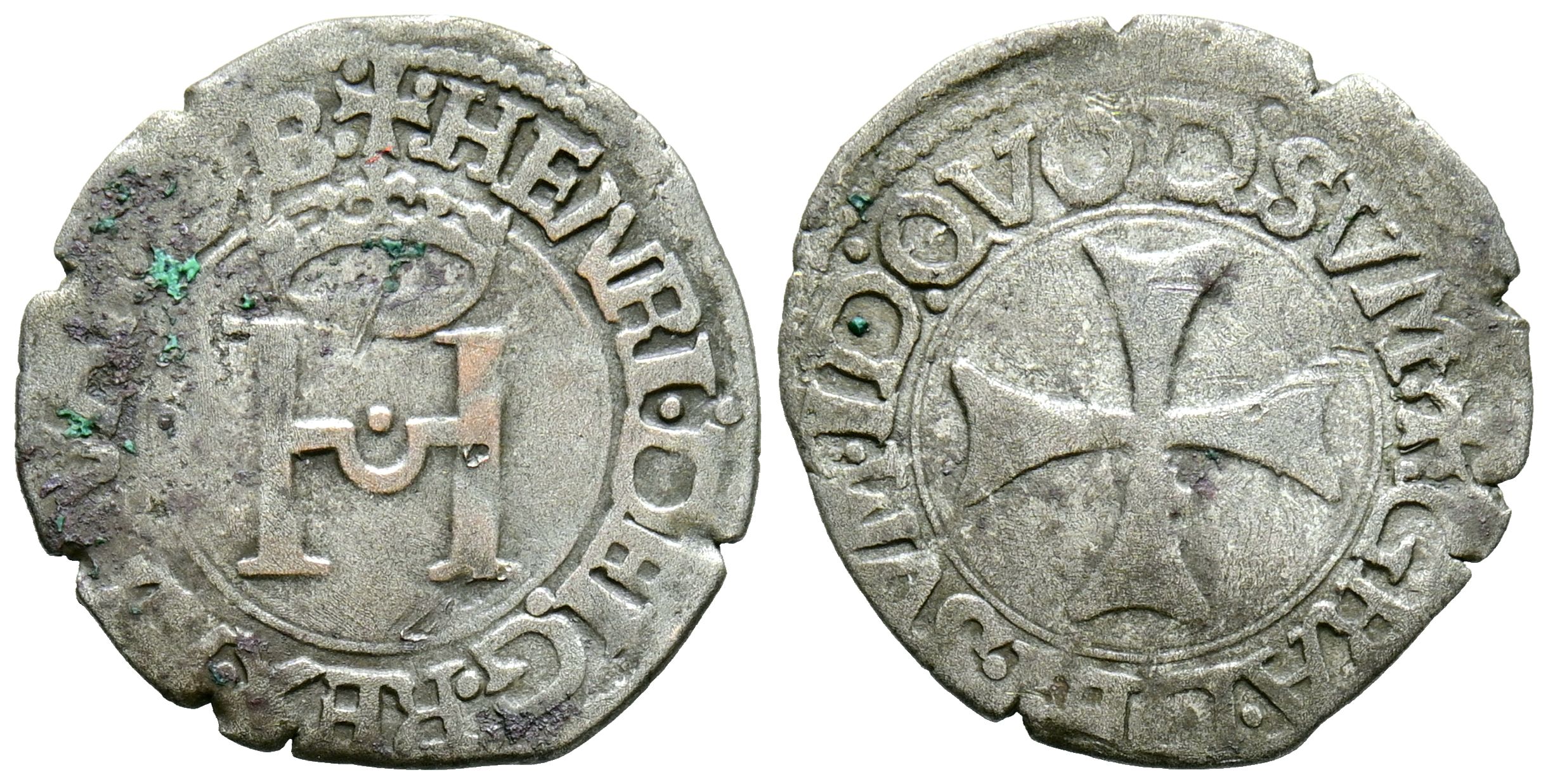 FRANCE, Henry of Albret (1516-1555). Liard. (Ve. 0.89g/18mm). Béarn (French Navarre). (Duplessy 1291, Large Cross Type). Anv: H crowned, around legend: HENRI DEI G REX NAVAR D B. Rev: Gande cross within graphic, around legend: GRA DEI SVM ID QVOD SVM. Almost Very Fine. Verdigris points.
