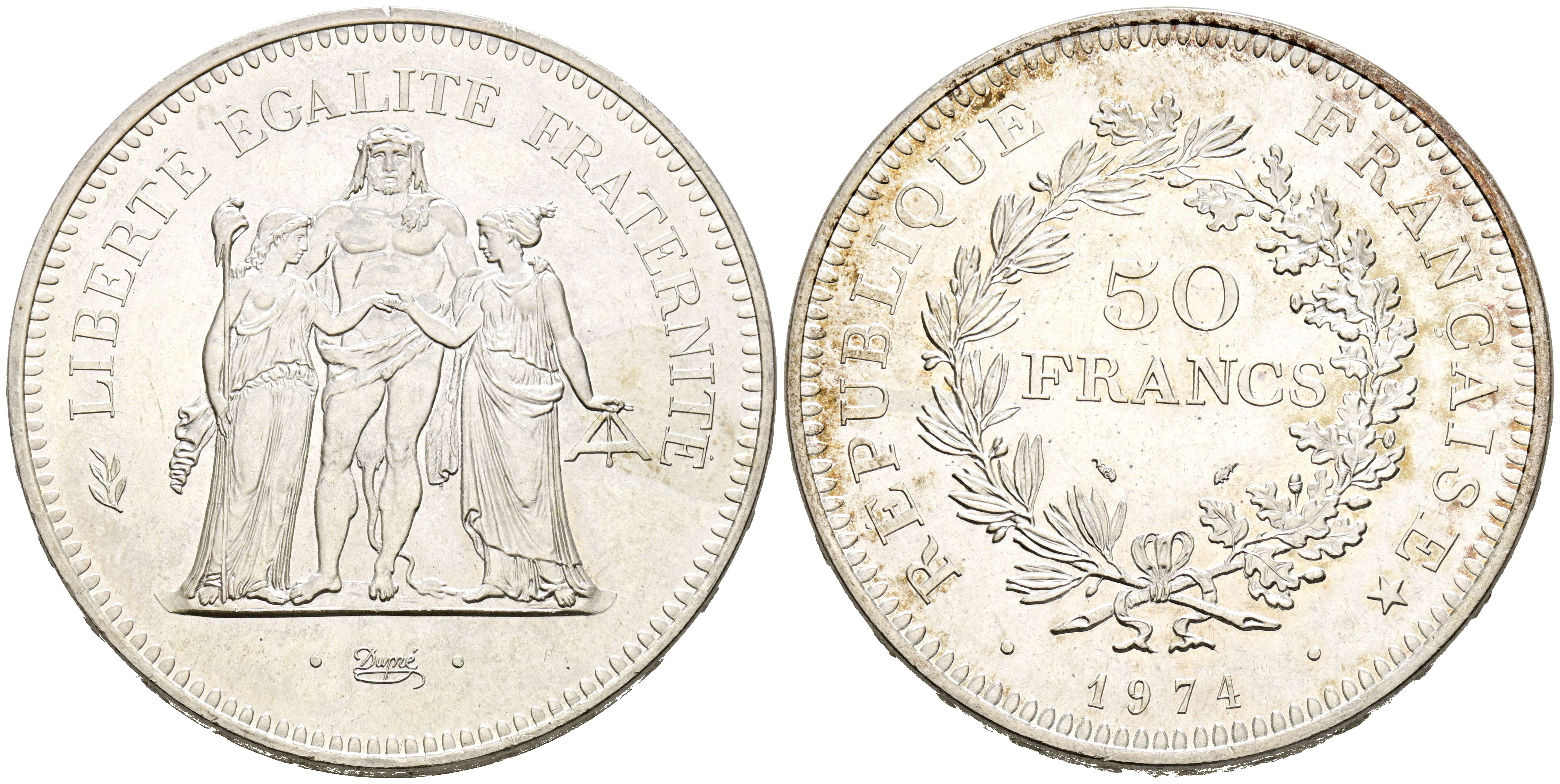 FRANCE. 50 Francs. (Ar. 29.80g/41mm). 1974. Hercules. (Km#941). Good Extremely Fine.