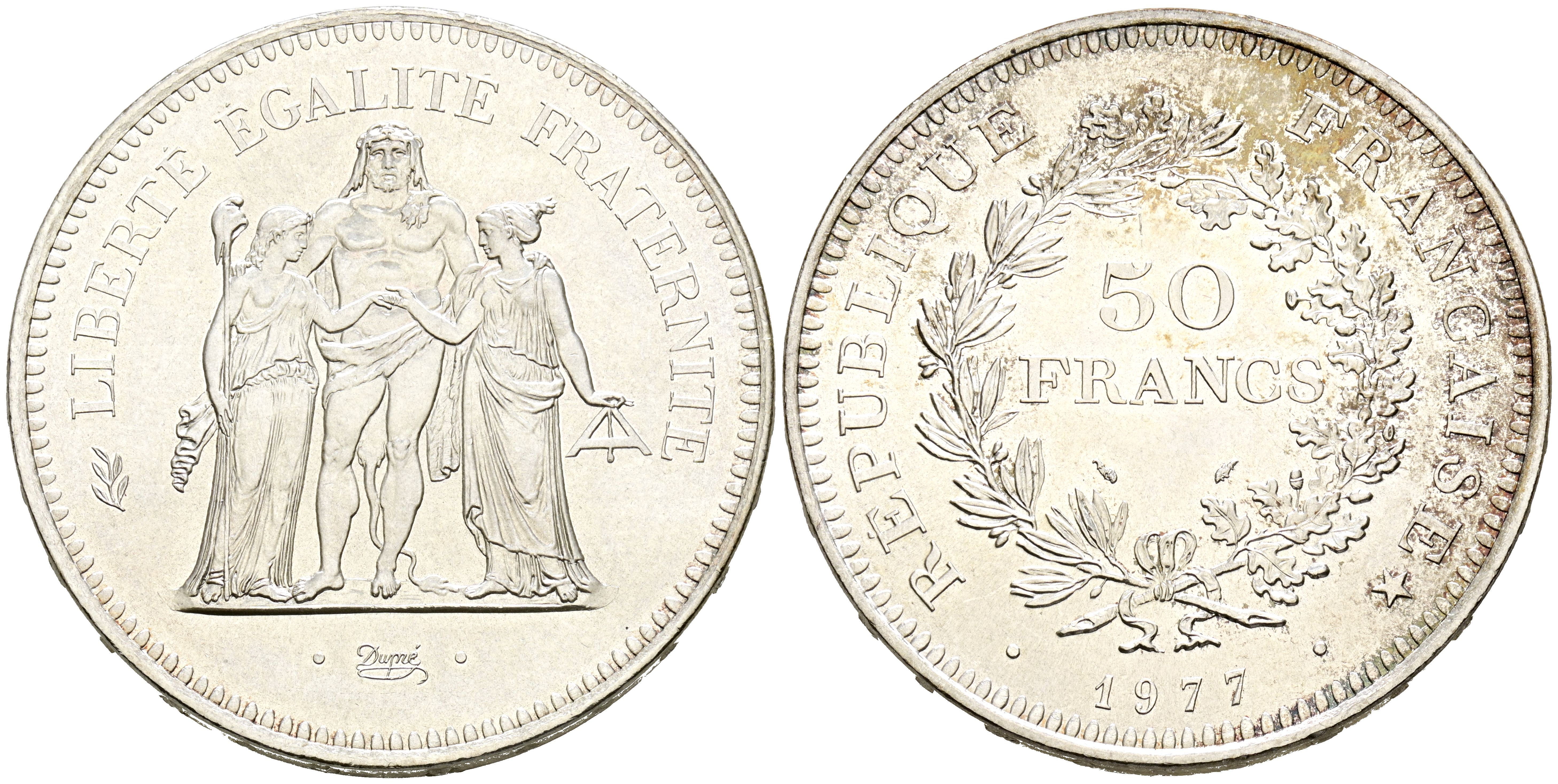 FRANCE. 50 Francs. (Ar. 29.98g/41mm). 1977. Hercules. (Km#941). Good Extremely Fine.