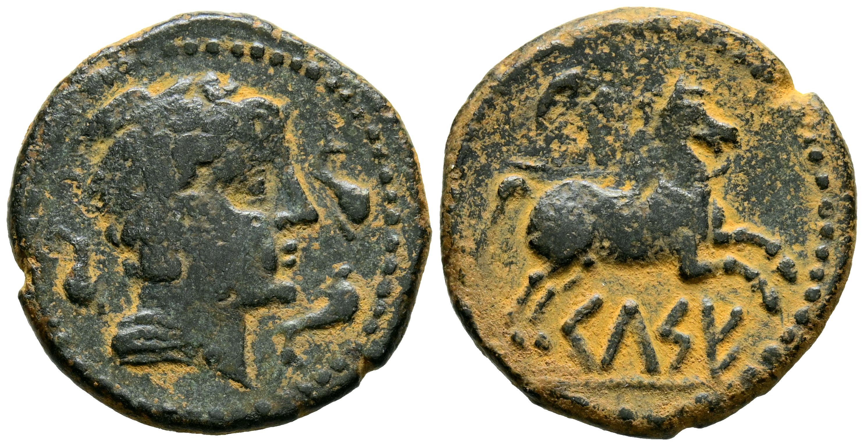 CELSE (Velilla del Ebro, Zaragoza). Semis. (Ae. 4.85g/21mm). 120-50 BC (FAB-782). Anv: Male head on the right surrounded by three dolphins. Rev: Horse with bridle on the right, crescent above, Iberian legend below on line: CeLSE. Very Fine.