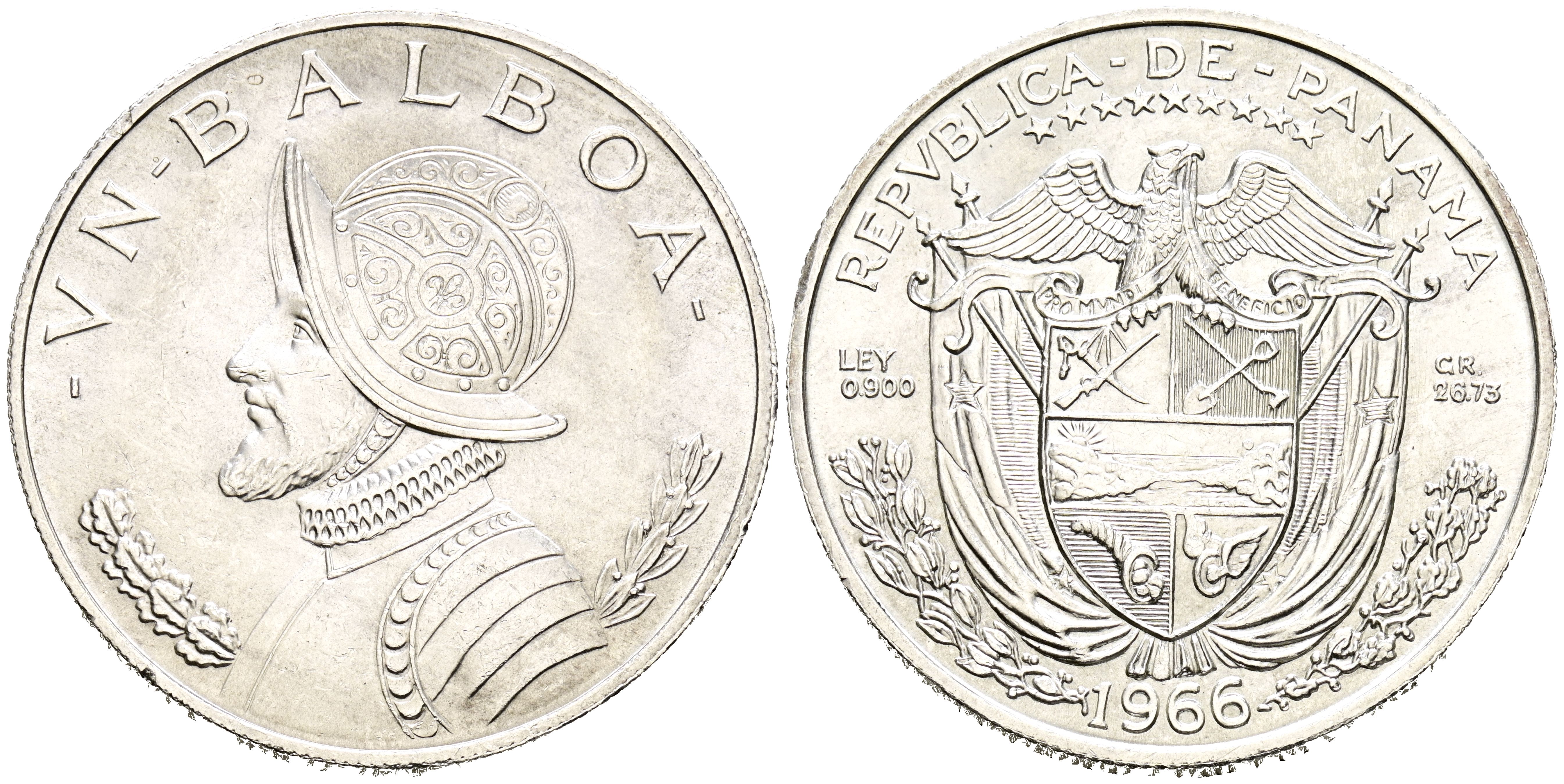 English PANAMA. 1 Balboa. (Ar. 26.60g/38mm). 1966. (Km#27). Almost Uncirculated. Light marks.