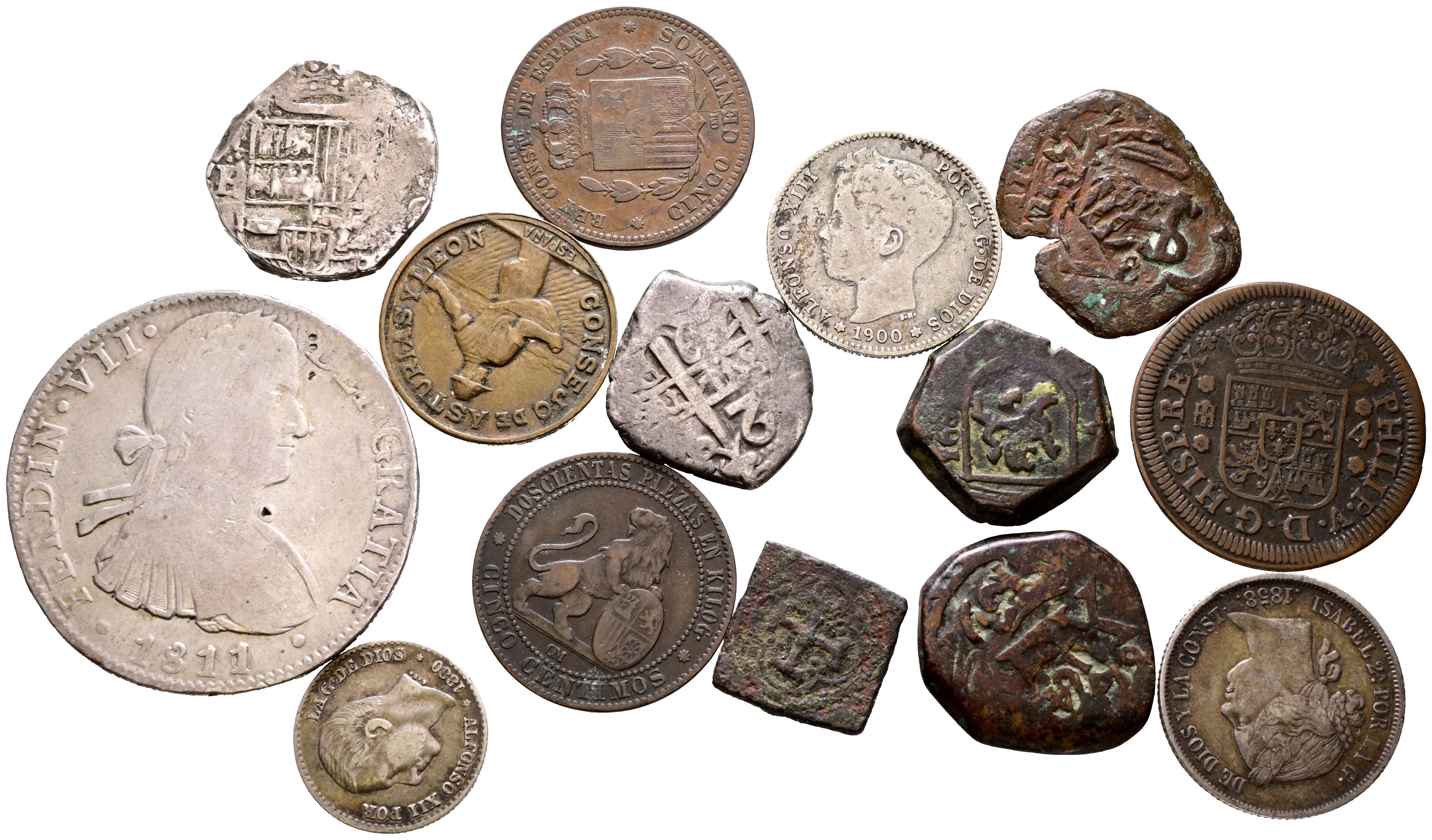 SPANISH MONARCHY AND CENTENARY OF THE PESETA. Interesting set made up of 14 coins from different periods, modules and materials. Different states of conservation. IT IS ESSENTIAL TO EXAMINE.