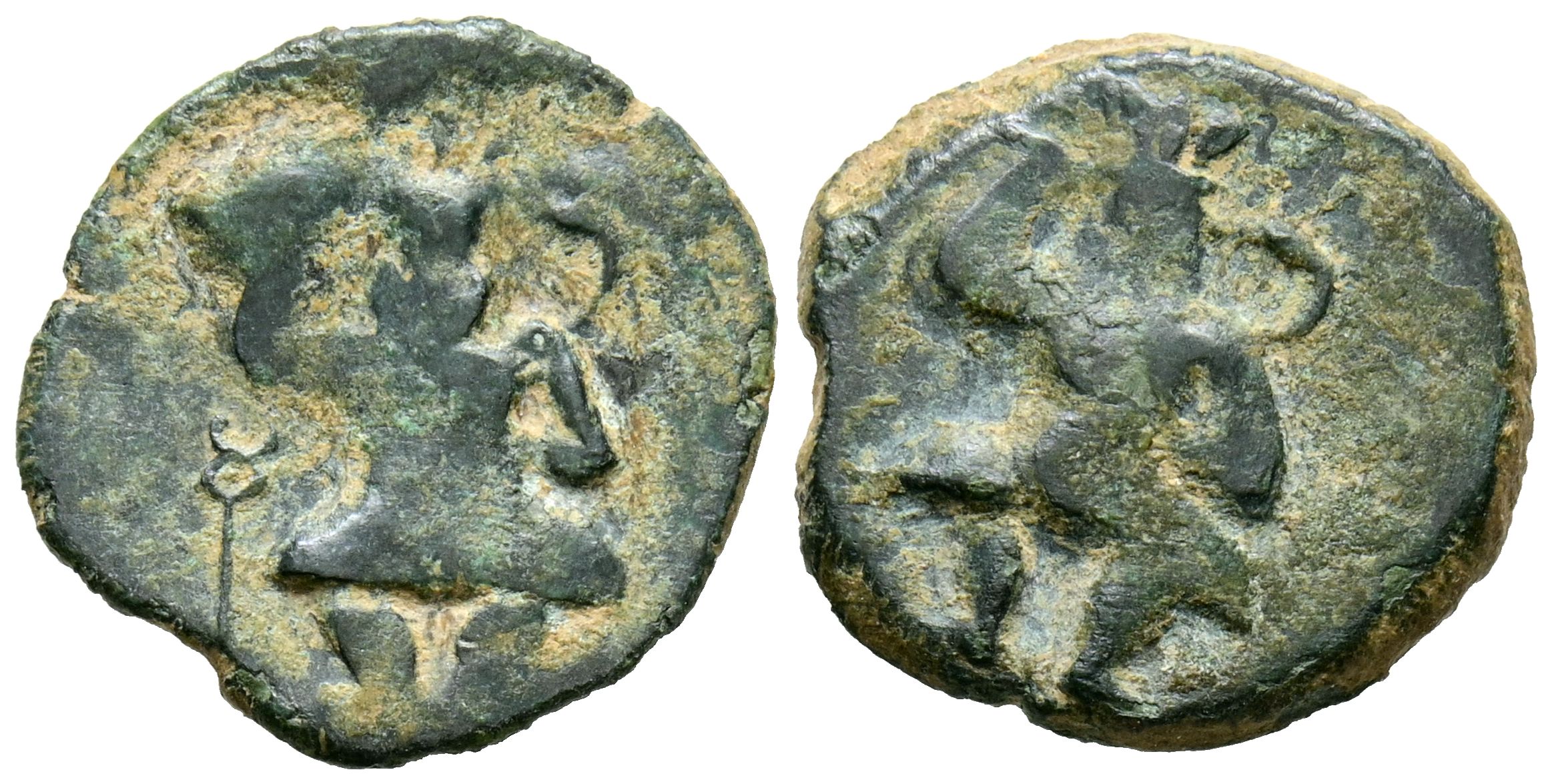 English EBUSUS (Ibiza). 1/4 of Calco. (Ae. 2.55g/16mm). 300-200 Fine (FAB-936). Anv: Bes with skirt holding Indian hammer and snake, caduceus mark on the left. Rev: Bes with skirt holding Indian hammer and snake. Very Fine.