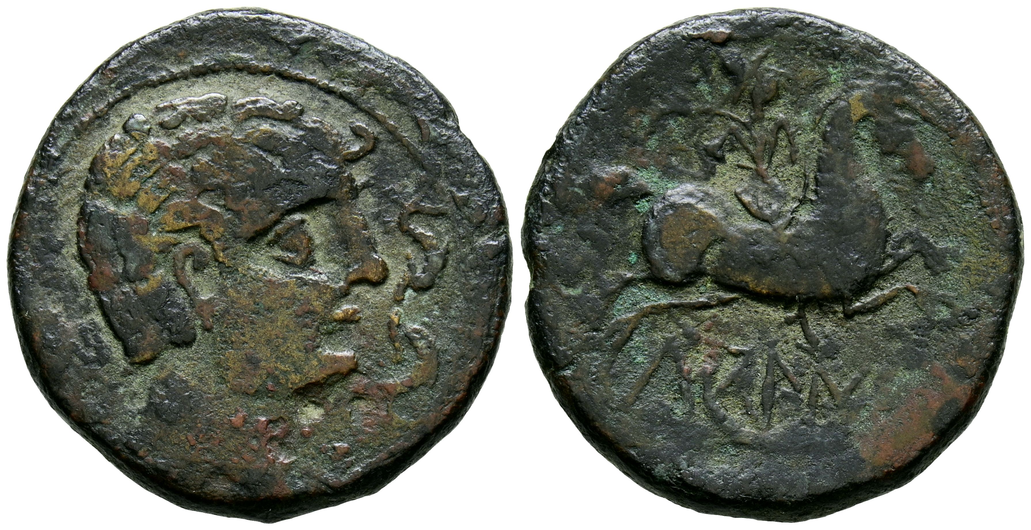 LAGINE (Aragon Zone). As. (Ae. 8.73g/26mm). 120-20 BC (FAB-1656). Anv: Male head with ornaments on the right, around three dolphins. Rev: Rider with palm to the right, below Iberian legend on line: LAGiNE. Almost Very Fine.