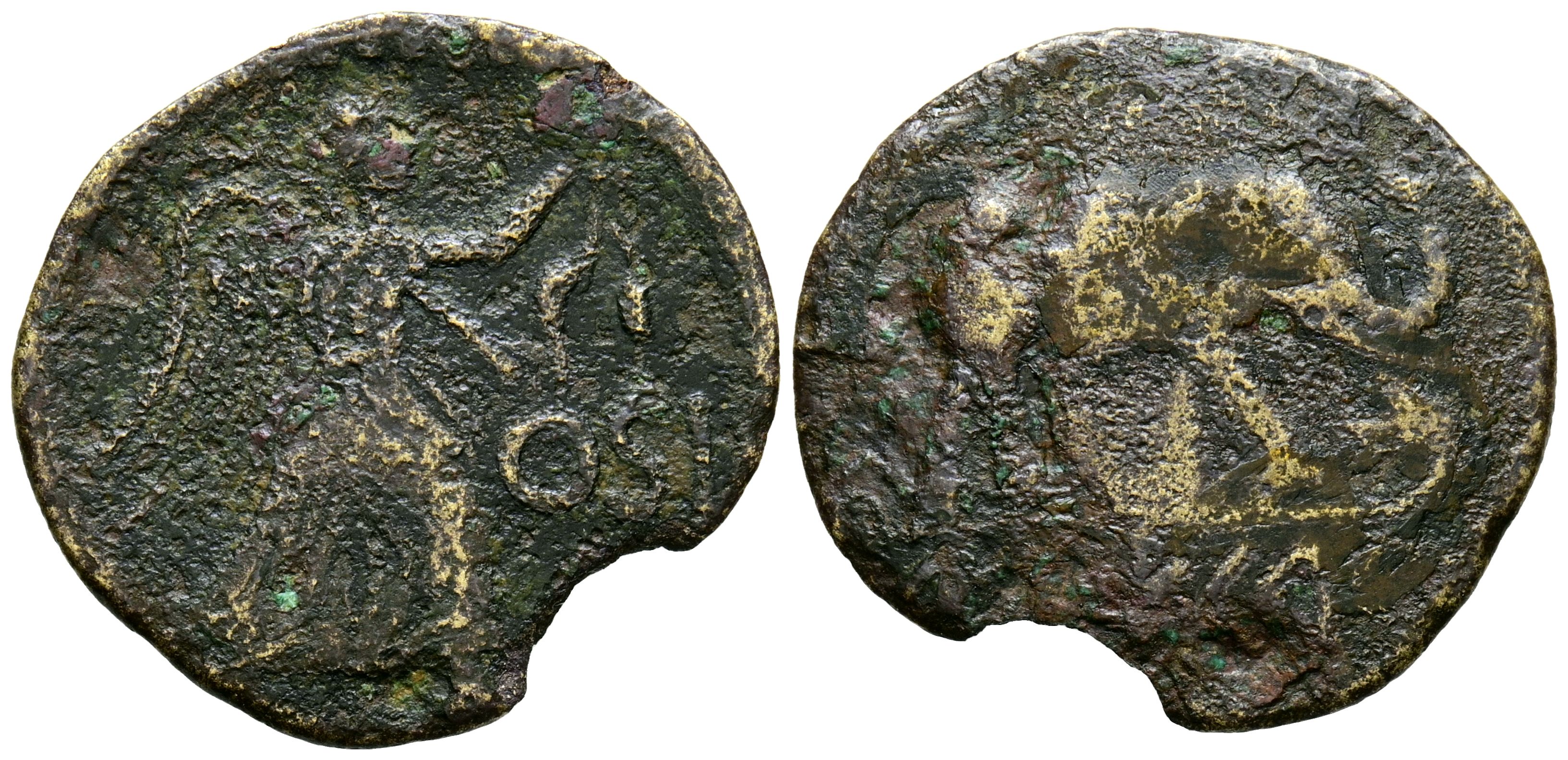 OSICERDA. Semis. (Ae. 2.83g/23mm). 50-20 BC (FAB-1956; ACIP 1292). Anv: Victory advancing to the right with crown and palm, in front OSI. Rev: Elephant advancing to the right stepping on Gallic carnyx, below between lines: USEKeRTe. Almost Fine. Very missing and cleaned flake. Strange.