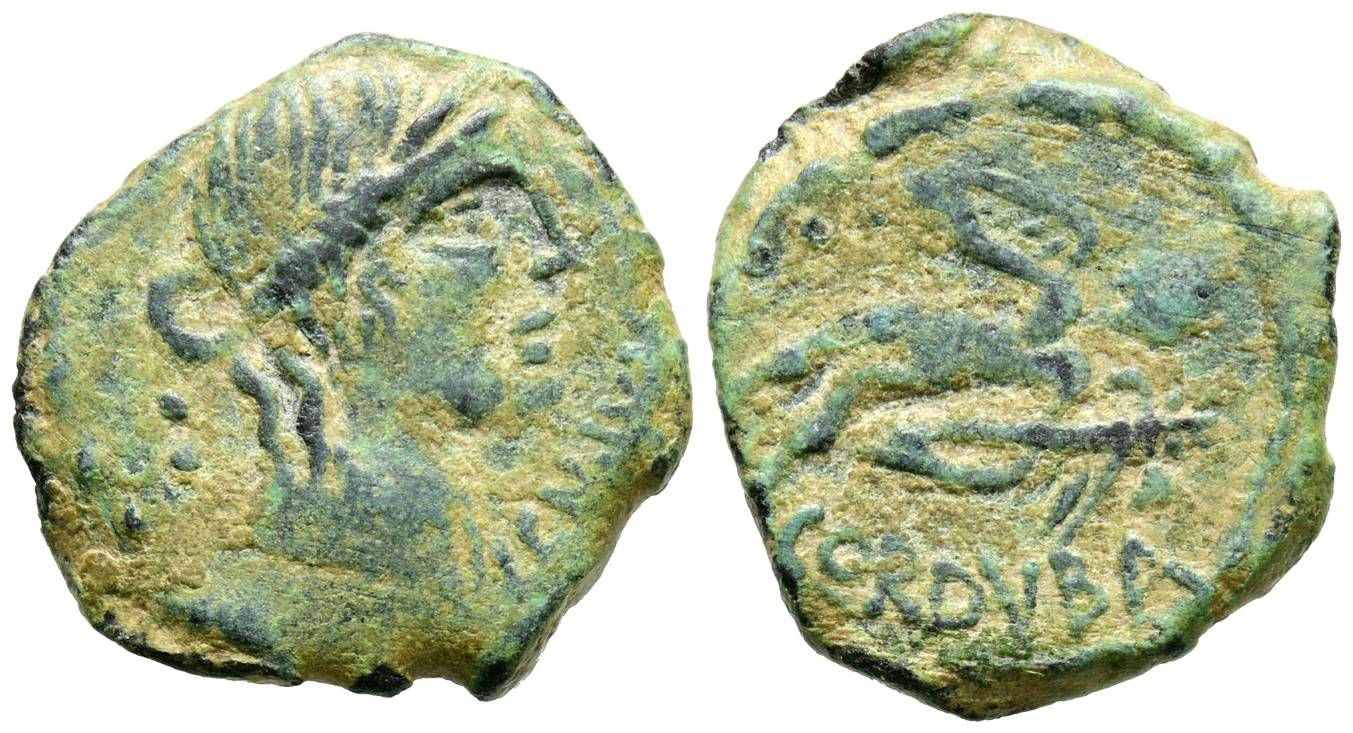COLONIA PATRICIA (Córdoba). Semis. (Ae. 4.14g/19mm). 50 BC (FAB-1984). Anv: Diademed head of Venus to the right, three points behind, legend in front: CN IVLI FQ. Rev: Cupid with cornucopia and torch to the left, in front three points, behind legend: CORDVBA. Very Fine. Green patina.
