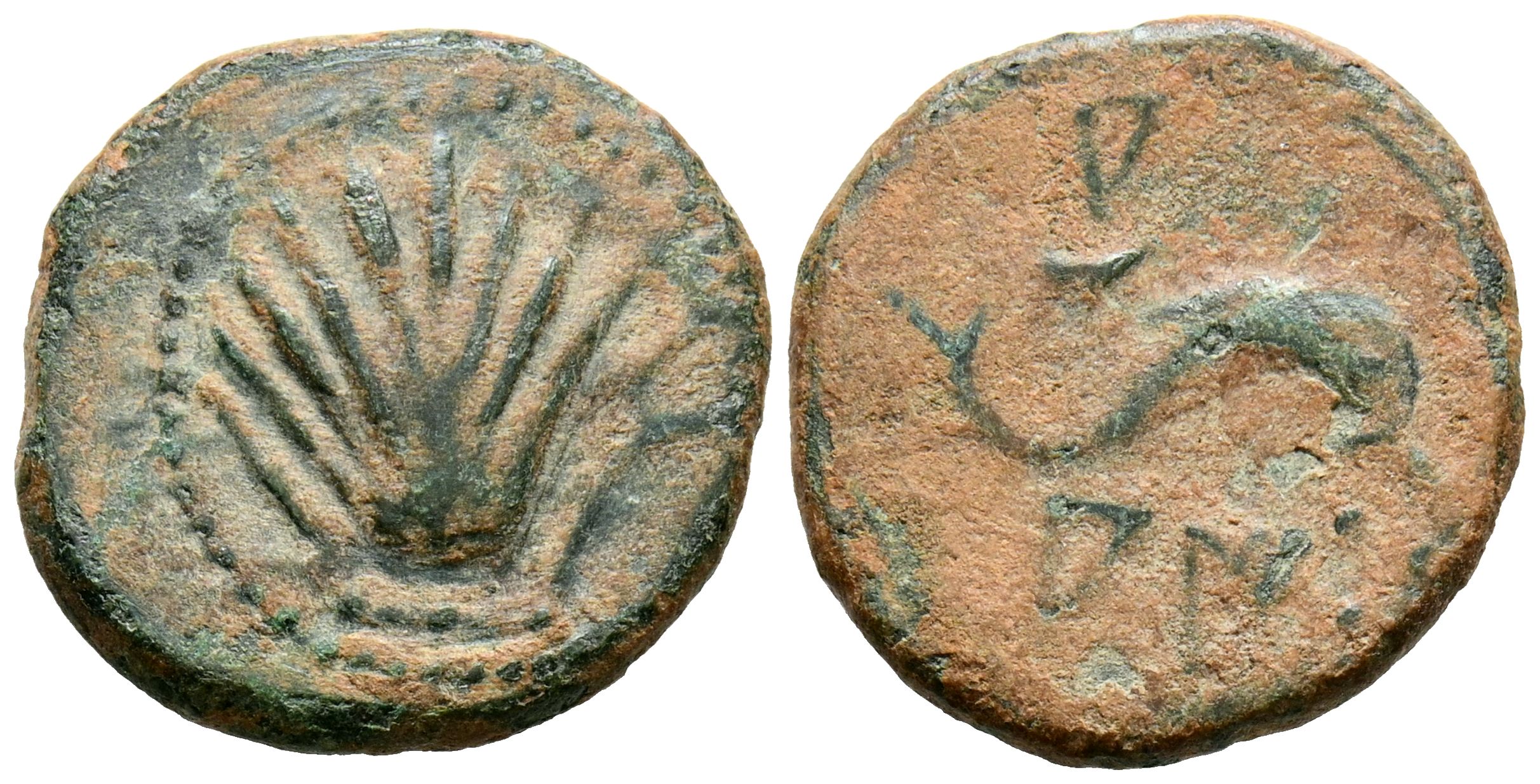 English ARSE-SAGUNTO (Sagunto, Valencia). Quadrant. (Ae. 3.24g/18mm). 170-20 BC (FAB-2052). Anv: Dolphin, above Iberian letter: A and crescent, below Iberian letters A, I and three dots. Almost Very Fine.