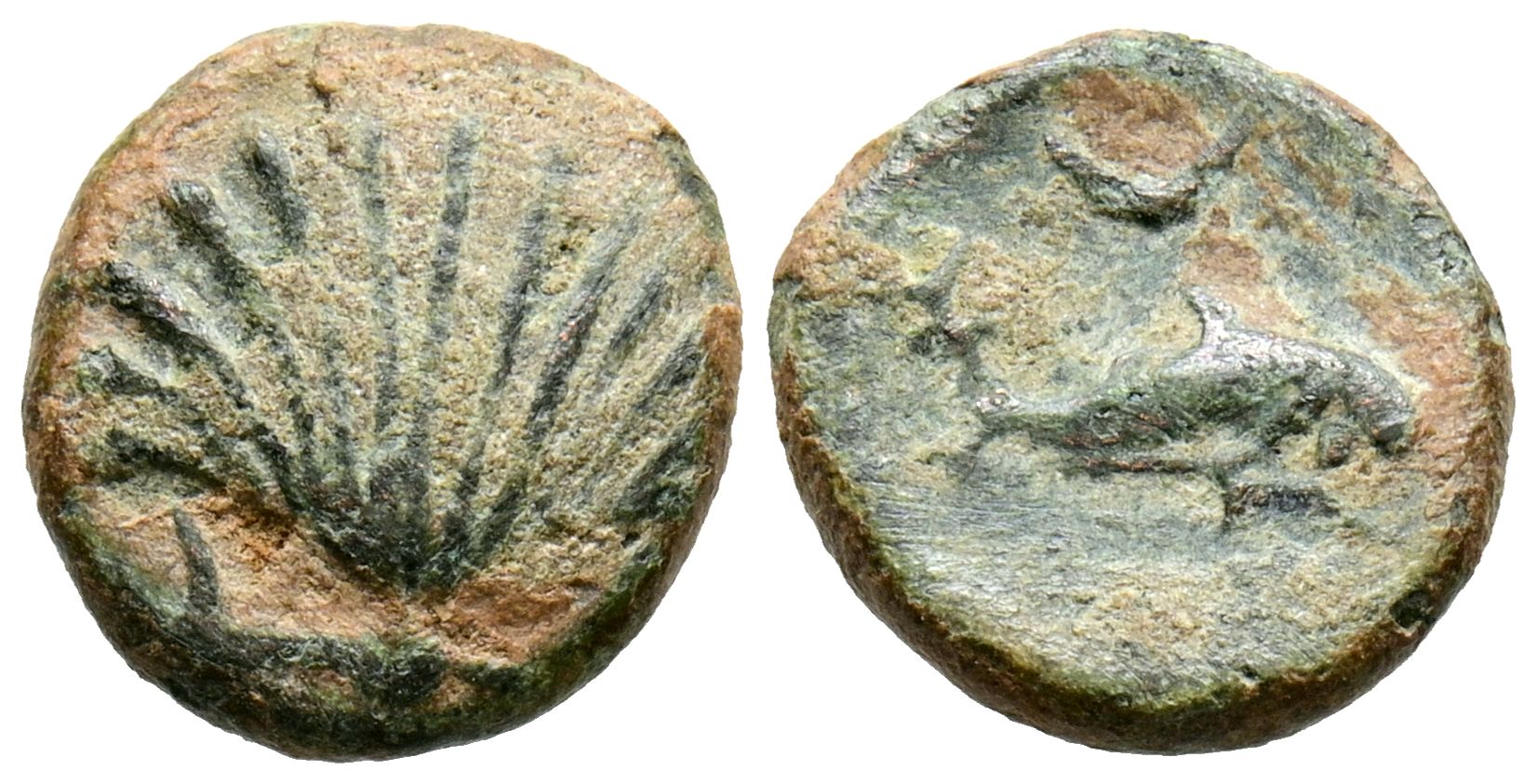 ARSE-SAGUNTO (Sagunto, Valencia). Sextant. (Ae. 1.40g/12mm). 170-20 BC (FAB-2065). Anv: Shell. Rev: Dolphin to the right, crescent above. Very Fine.