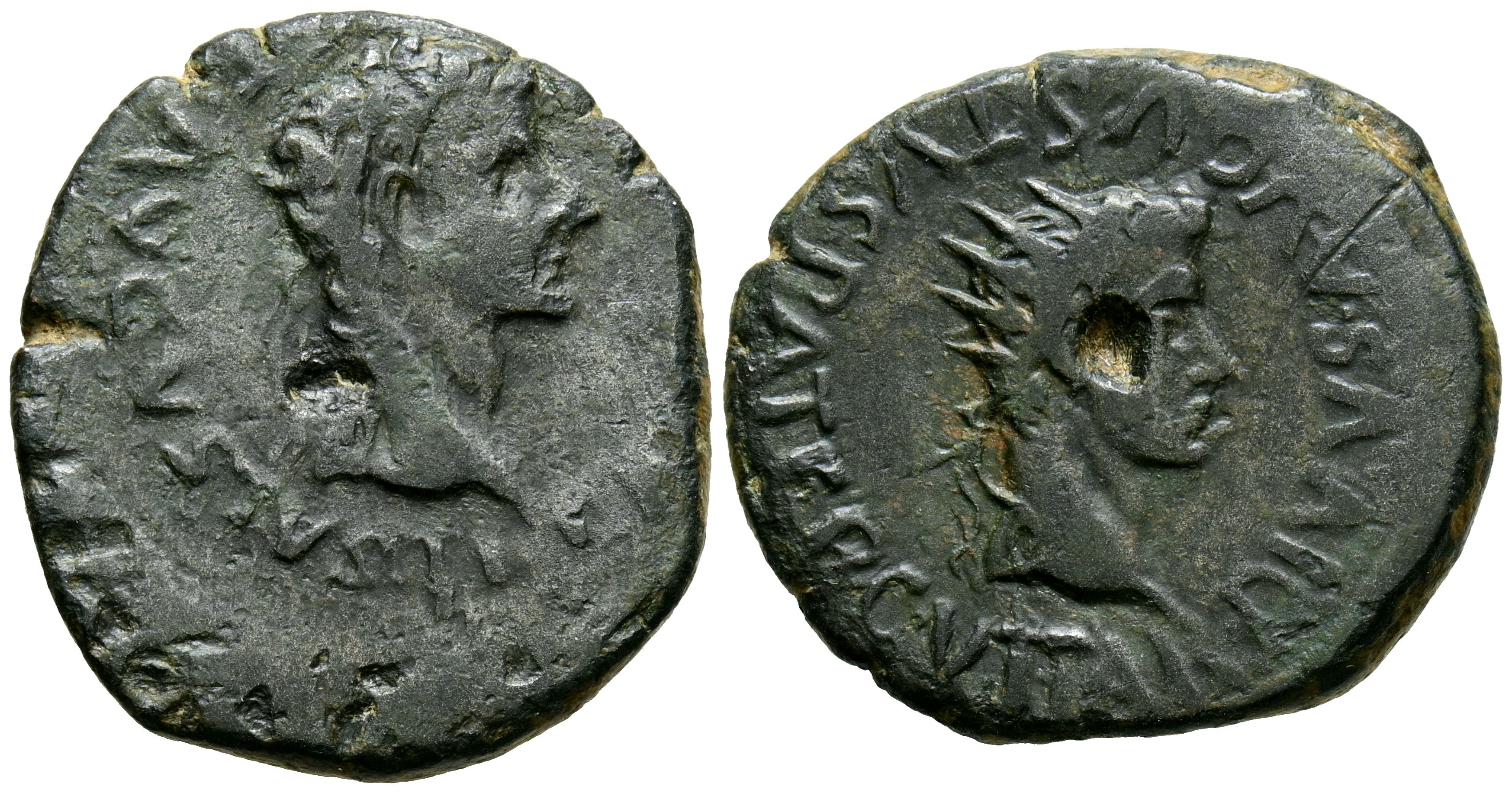 TARRACO (Tarragona) As. (Ae. 8.12g/25mm). 14-36 AD (FAB-2373). Anv: Head of Laureate Tiberius to right: TI CAESAR DIVI AVG F AVGVSTVS. Rev: Radiated head of Augustus to the right, around legend: DIVIS AVGVSTVS PATER CVT TAR. Very Fine.